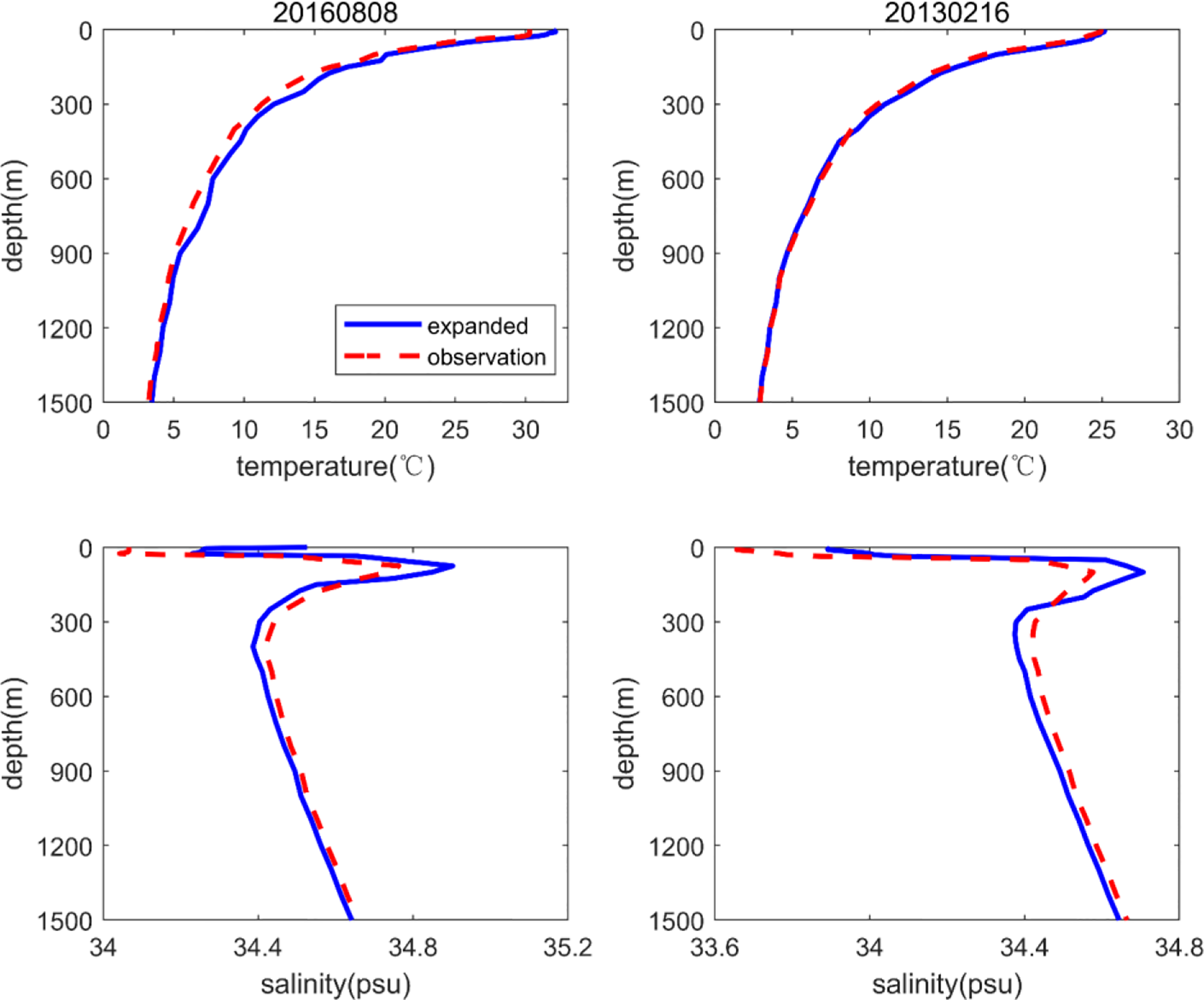 Stations 20160808 and 20130216 in Figure 8 were selected for further study. The expanded T–S profiles are compared with the observed data in Figure 12. The results show that the expanded profiles are close to the observed profiles, proving that the expanded field can be verified by cross-validation tests.