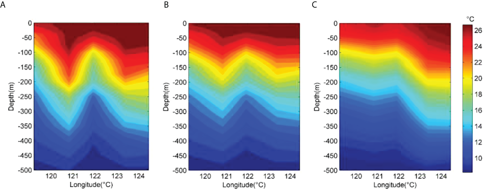 Temperature profiles of the cross-section (Figure 8) based on the observations (A), expanded temperature field (B) and WOA18 (C), respectively.