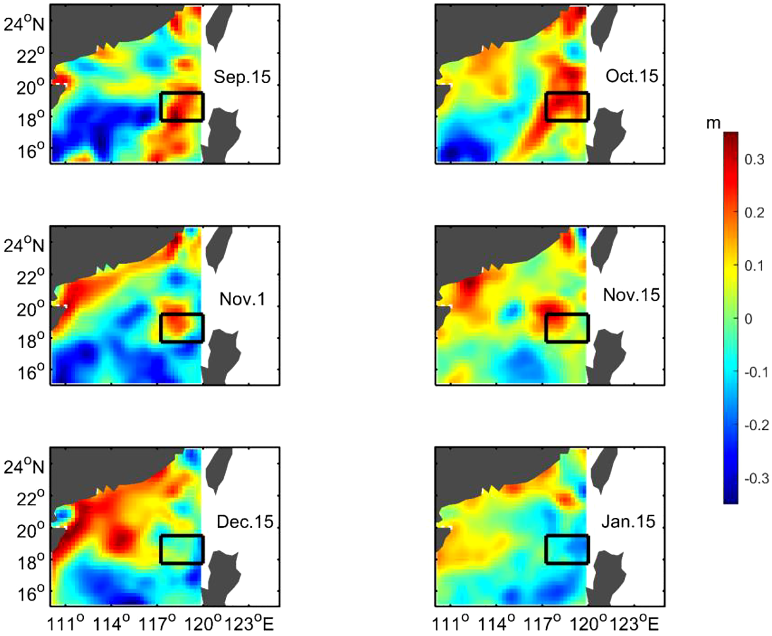 The Luzon Warm Eddy (LWE) was first recognised as an anticyclonic ring centred at about 117.5°E, 21°N in summer (Li and Pohlmann, 2002). Yuan et al. (2007) used altimeter data to identify the ring as an anticyclonic eddy generated off the northwestern coast of Luzon Island and gave the LWE its name. The LWE is a seasonal phenomenon closely related to sea level anomalies (SLA). Figure 14 describes the variation of SLA during the LWE, and a black square was seleted as the target area. The results show that an anticyclonic eddy gradually formed a ring from 15 September 2006 through 5 November 2006, with high SLA in the target area. It then moved westward and finally disappeared on January 15, 2007 and the SLA in the target area decreased accordingly.