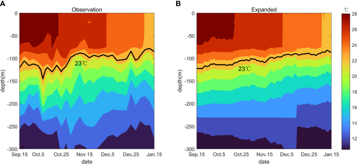 Temperature profiles corresponding to the black squares in Figure 14 based on the observation data (A) and the expanded temperature field (B), respectively. The black lines are isotherms of 23°C used as a thermocline proxy and the interval bewewen color contours is 2°C.