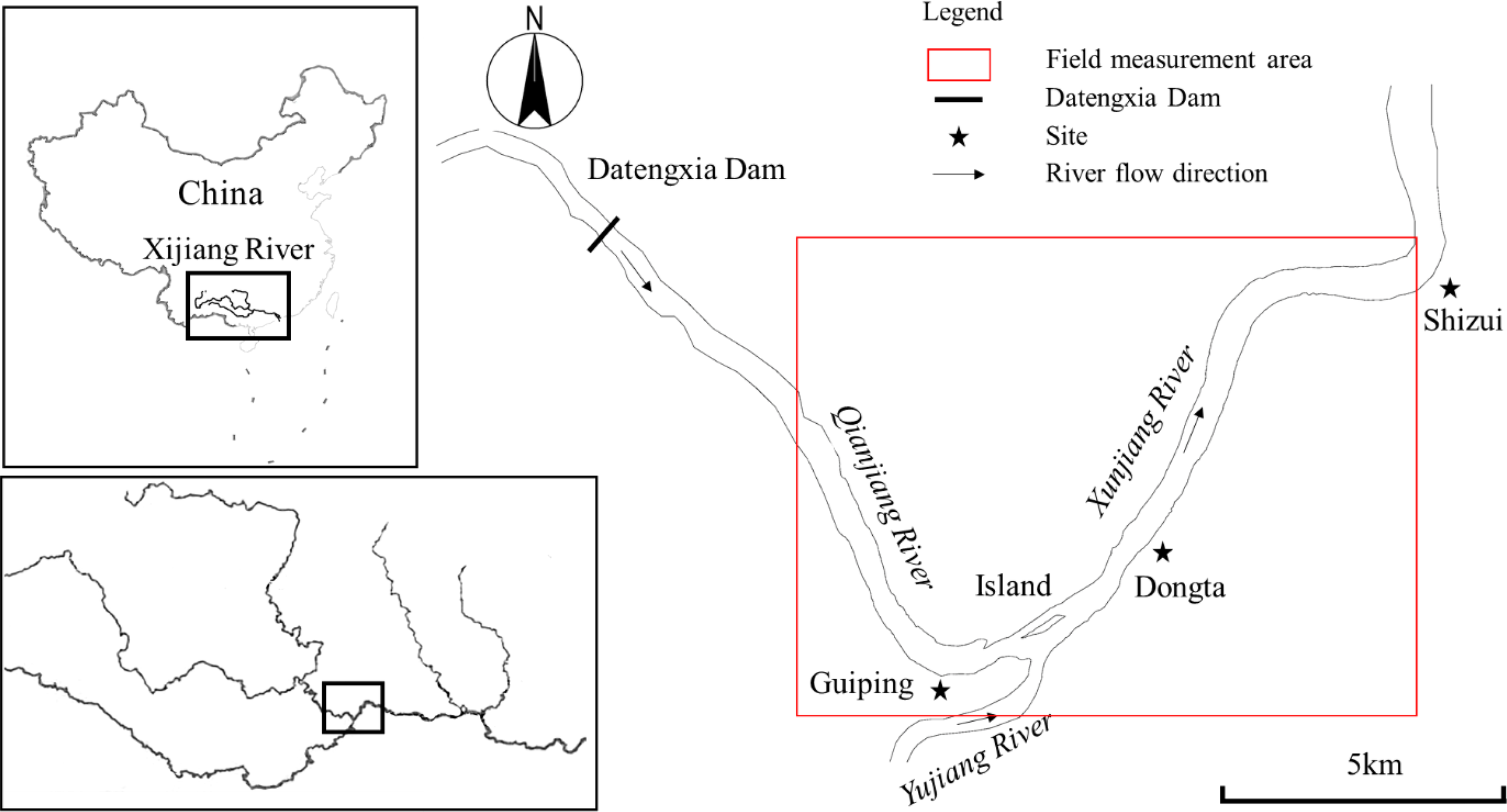 Dongta spawning reach in Xijiang River is selected as a case to carry out the research. Based on existing research, Dongta spawning reach is the second largest existing spawning area in China, and very important spawning area for Asian carp in Pearl River (Wan et al., 2018; Liu et al., 2022). Meanwhile, this reach will be designated as an ecological reserve according to the local Fisheries and Fisheries Administration, which is of great significance to the reproduction and protection of fish in the Pearl River. It is situated within the middle reaches of the Pearl River Basin, namely, at the confluence of the Yujiang, Xuanjiang, and Qianjiang Rivers (Figure 1). The terrain here is diverse, with alternating deep pools and shallows. Dongta spawning reach has abundant water. The annual average flow is 5266m3/s. The average annual rainfall is 1717.5mm. This exceptional geographical location provides fish with sources of abundant food, suitable hydrodynamic conditions, etc. The migration and spawning of fish during spawning seasons mainly occur in the section of the river below the Datengxia Reservoir. For this reason, we chose the 4 river kilometers downstream of the Datengxia Reservoir as the starting, to 18 river kilometers downstream (covering upstream and downstream of the Dongta Village) as the case study area.
