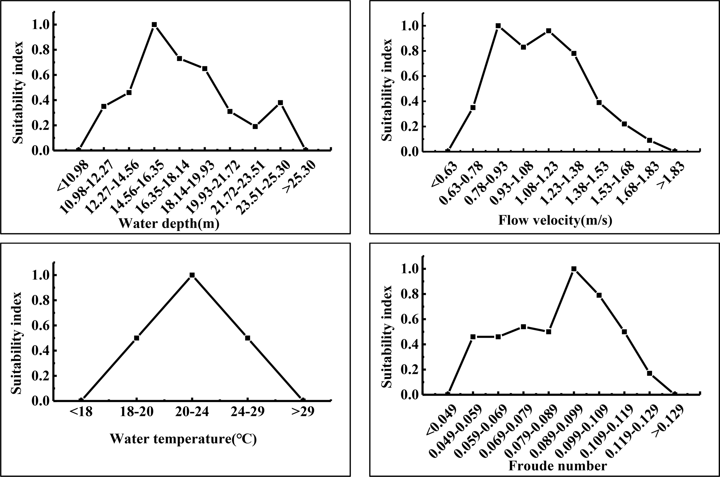 Table 2 provides all measured data of the study area. A total of 78 cross sections and 585 measuring points, where each measuring point includes water depth, flow velocity, and water temperature, were calculated along with the Froude number. The size range of each hydraulic factor collected should cover the range of suitability curve (suitability Index greater than zero). The data collected on site are as follows: Water depth is 2.44~30.36m; Flow velocity is 0.14~4.09m/s; Water temperature is 25.38~28.50°C; Froude number is 0.013~0.523 (see Table 2). The range of suitability curve was as follows: Water depth was 10.98~25.30m; Flow velocity is 0.63~1.83m/s; Water temperature is 18~29°C; Froude number is 0.049~0.129 (see Figure 2). Among them, water temperature is one of most important factors that trigger the spawning of Asian carp, and is within the range of suitability curve for Asian carp (20~24°C;). The other sampled indicators are greater than range.