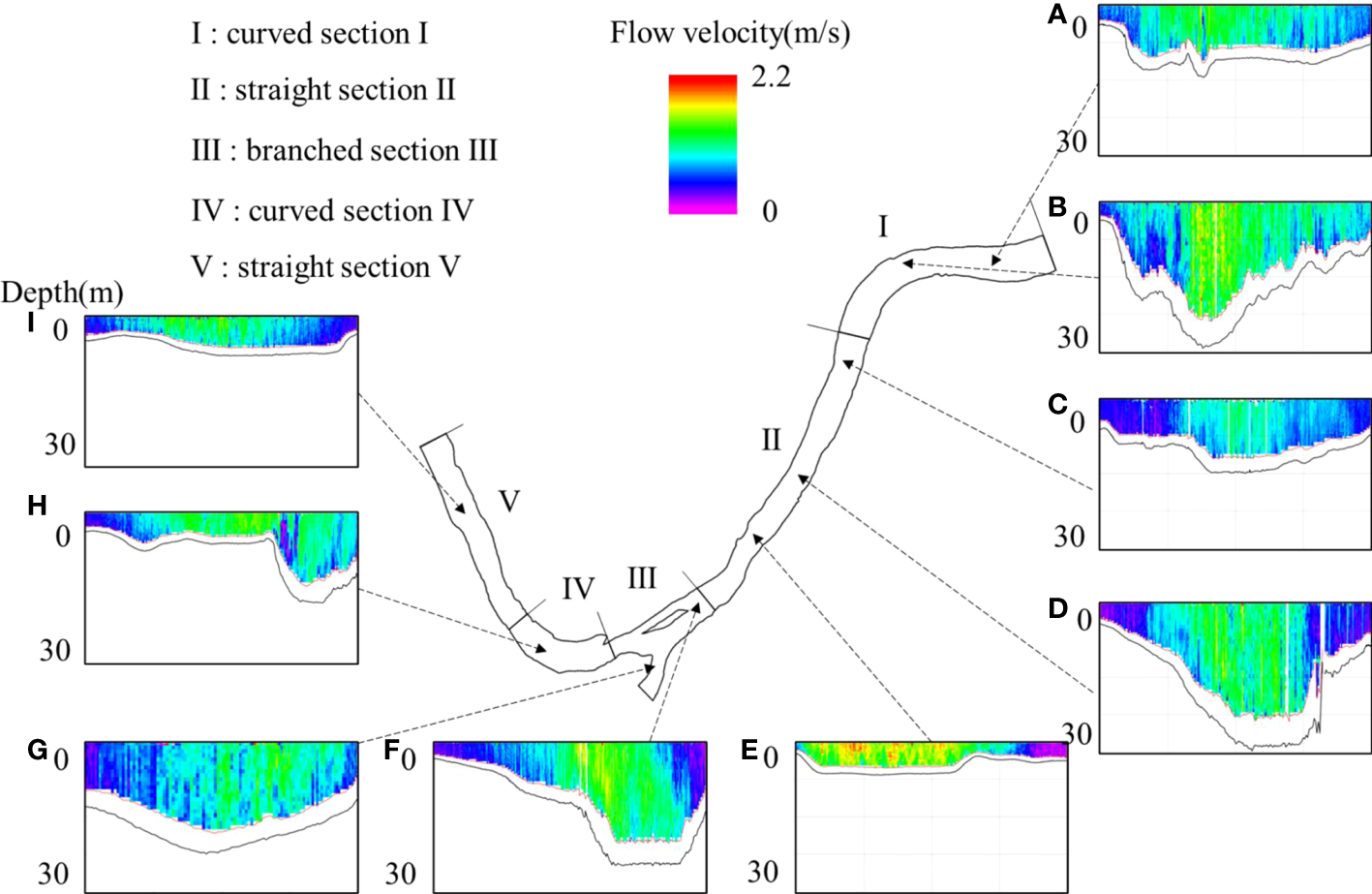 Plan and typical cross-sectional characteristics of the study area. (A–I) Directionally represent the downstream to upstream reaches along the study area.