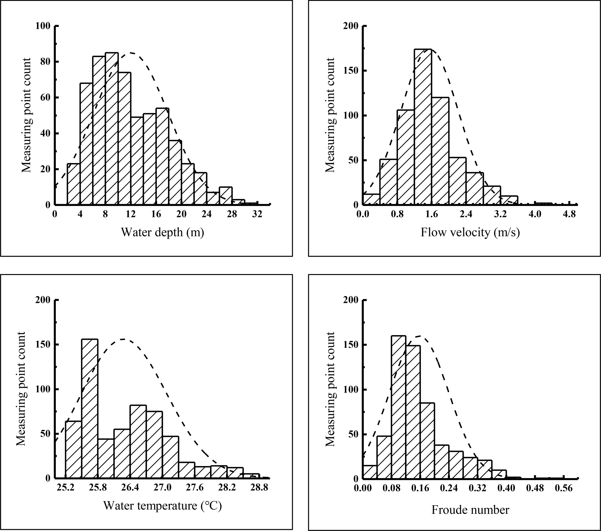 The histogram (Figure 5) shows that the frequency distribution of water depth, flow velocity, and Froude number was close to normal distribution. However, water temperature was not. Water depth distribution was skewed to the right. The frequency distribution of flow velocity was similar to normal distribution. The distribution of the Froude number was skewed to the right. Water temperature was mainly distributed (skewed) to the left, which may indicate that the sampling area was too small. However, different areas exhibited a degree of distinction. This study used a total of 564 measuring points with water depths between 2 and 22m, accounting for approximately 93.33%. There were 495 measuring points with flow velocities between 0.2 and 2.2 m/s, accounting for approximately 84.62%. There were 509 measuring points whose water temperatures were between 25.4 and 27.2°C;, accounting for approximately 87.01%. Finally, there were 477 measuring points with Froude number between 0.025 and 0.225, accounting for approximately 81.54%.