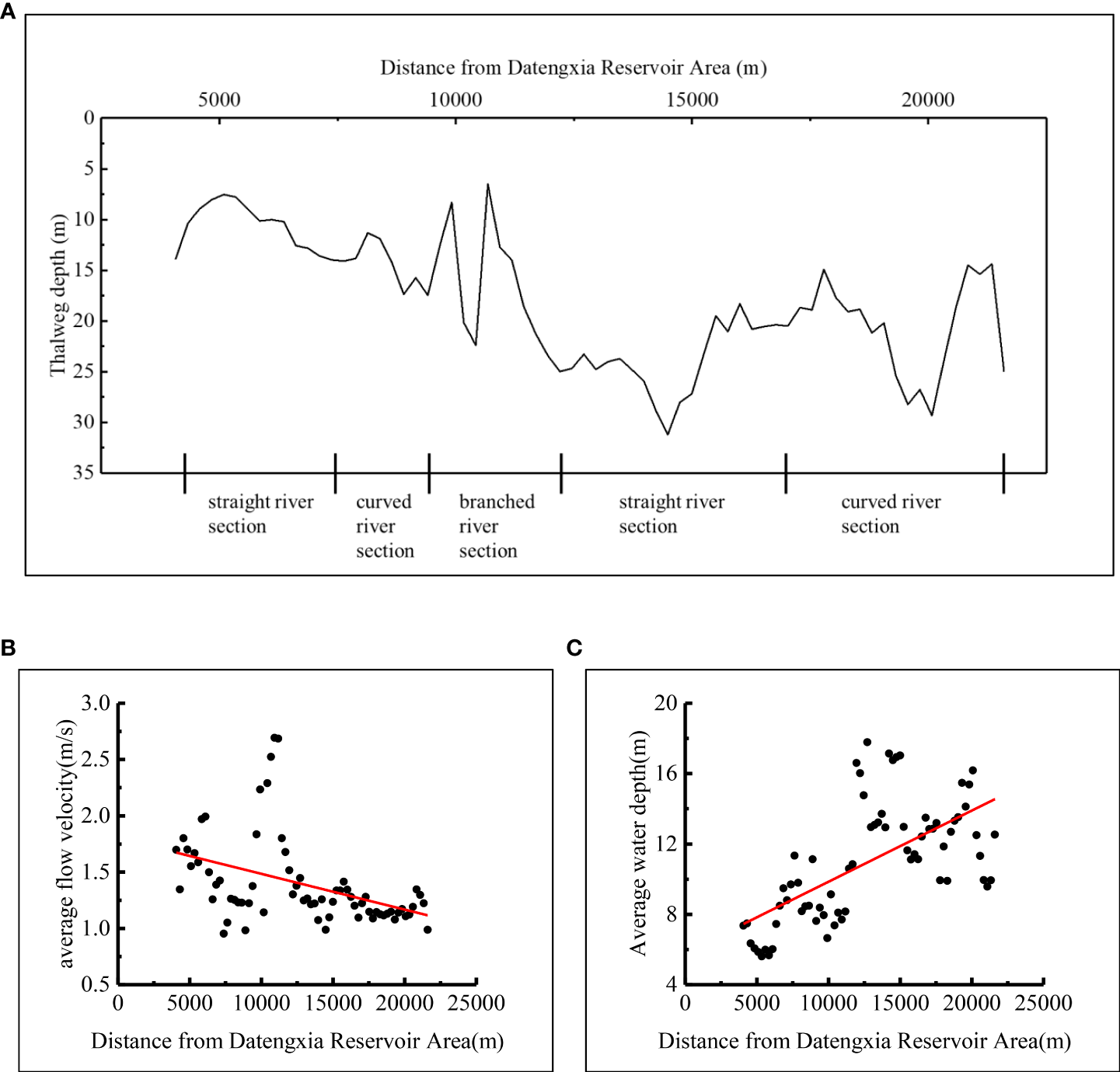 Flow characteristics of the river section selected for this study. The mileage number of the Datengxia Dam is 0 river kilometer. (A) Thalweg depth; (B) average flow velocity at cross sections; (C) average water depth at cross sections.