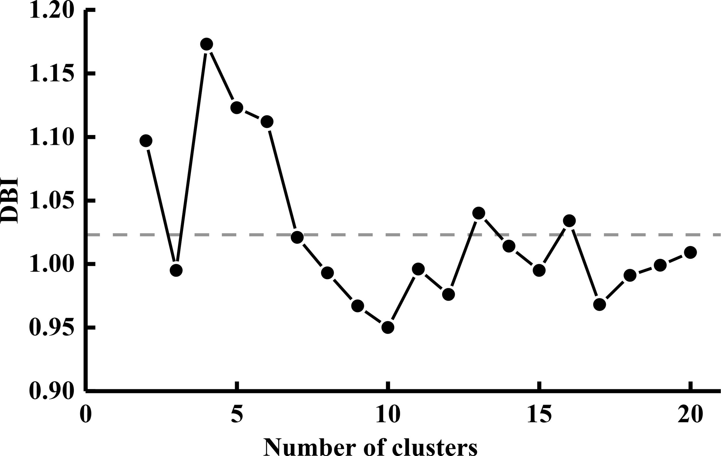 The Davies-Bouldin index evaluating clustering efficiency against the number of clusters. Lower index values indicate better clustering results. The dotted line represents the mean value of the index.