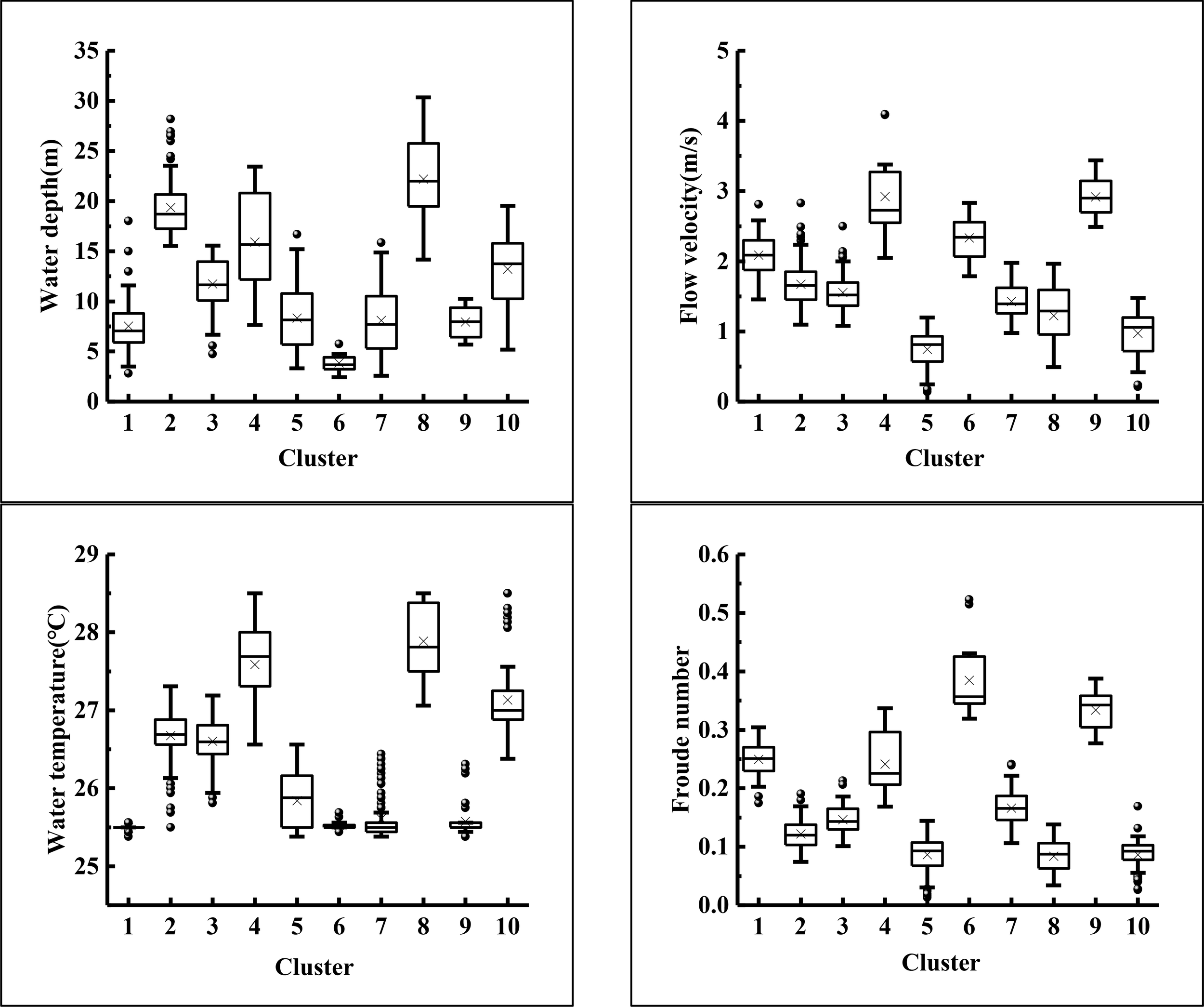 Characteristics of the 10 hydrologic and hydrodynamic types as determined by cluster analysis (see the Materials and Methods section for more detail). Each cluster defined by four hydrologic and hydrodynamic factors: water depth, flow velocity, water temperature, and Froude number. Cross shapes show the average value of each factor in a cluster, which indicates the average position of a cluster. Box plots show the parameter dispersion values in the clusters. For box plots, lines represent the lower, median, and upper quartiles. Whiskers are the lines extending from the two opposite ends of the box plots, showing the range of the remaining data. Outliers are the data whose index value exceeds the whiskers (where whisker length is limited to 1.5 of the interquartile).