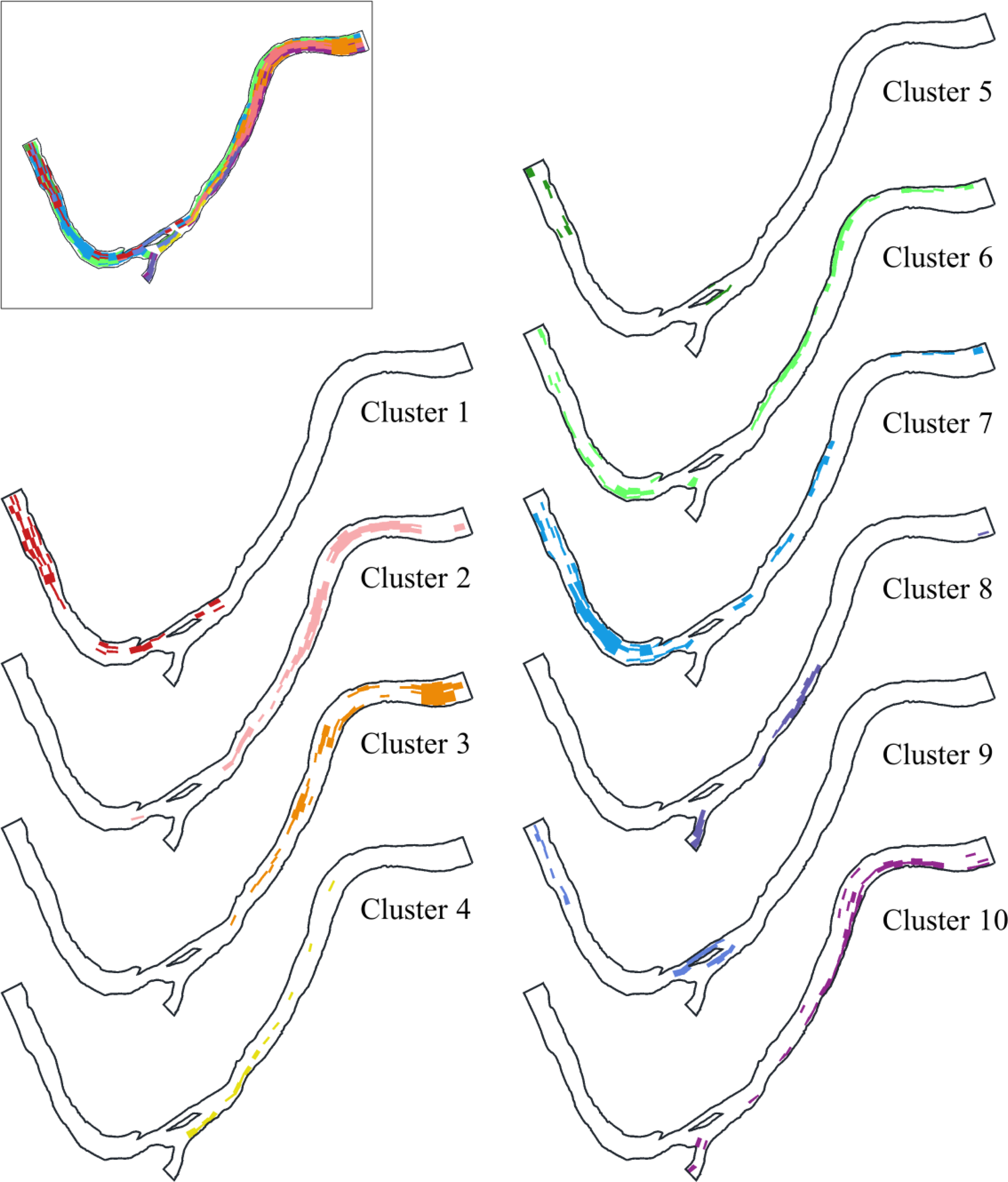 Data retrieved from the 585 measurement points were divided into 10 clusters, 10 being the number of clusters selected for k-means clustering. After being divided into 10 clusters, the statistical hydrologic and hydrodynamic characteristics of each cluster were determined (see Table 3 and Figure 8).