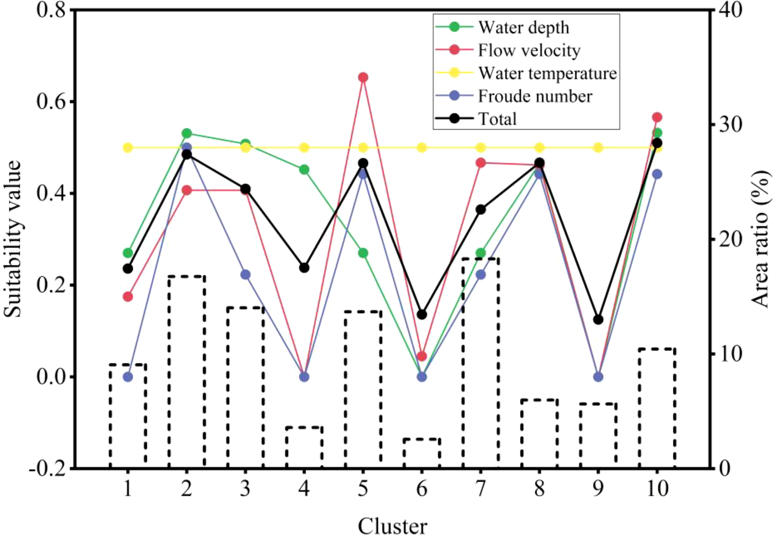 To ascertain the hydrologic and hydrodynamic characteristics of the 10 clusters, the data were sorted according to the numerical value and then divided into three (i.e., at one-third and two-third positions). Among them, average values of the hydrologic and hydrodynamic data of the various clusters were divided into high (a value greater than two-thirds), medium (a value between one-third and two-thirds), and low (a value less than one-third). For example, if the average water depth of a cluster is higher than two-thirds, the water depth of this cluster is defined as being high. By analogy, hydrologic and hydrodynamic characteristics of each cluster are shown in Table 4. The water depth tri-sectional quantile group was 2.44~8.47m, 8.47~14.39m, and 14.39~30.36m. The flow velocity tri-sectional quantile group was 0.14~1.24m/s, 1.24~1.70m/s, and 1.71~4.09m/s. The water temperature tri-sectional quantile group was 25.4~25.6°C;, 25.6~26.7°C;, and 26.7~28.5°C;. The Froude number tri-sectional quantile group was 0.013-0.114, 0.114-0.166, and 0.166-0.522.