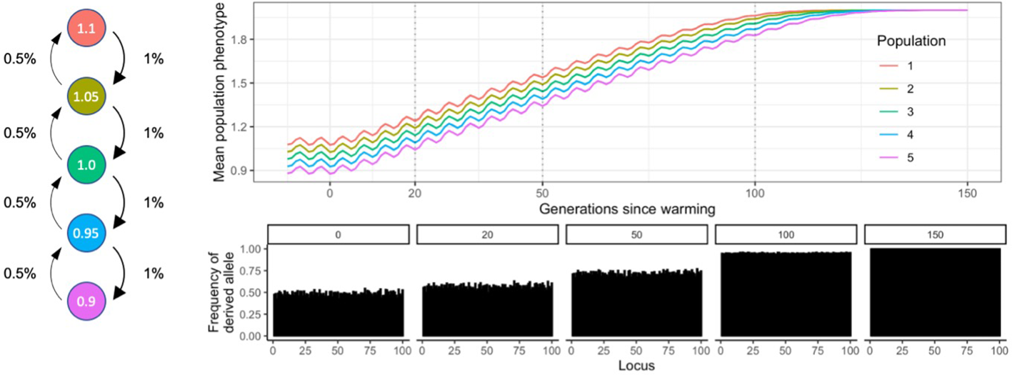 Five populations of a generic species were arranged spatially in a stepping-stone metapopulation (island model, Uecker et al., 2014), along an environmental (e.g. temperature) gradient, with population 1 having the highest phenotypic optimum trait value (1.1), and population 5 the lowest (0.9; Figure 1). These values can be easily rescaled, see below. The environmental gradient can be thought of as a temperature gradient along latitudes, and the phenotypic trait under selection as temperature tolerance, therefore, population 1 is warm-adapted, and population 5 is cold adapted. Although there are many other stressors impacting organisms globally, like drought, ocean acidification and disease, increasing temperatures have been the main focus of international action and investment (IPCC, 2022) and so we have targeted this factor here in our modelling. The environment was kept stable for 100 generations (“burn-in”), after which an El Niño Southern Oscillation (ENSO) – like cycle with an amplitude of 0.1 phenotypic trait value units, and a wavelength of five generations was faded in over 100 generations. This short burn-in period did not aim to achieve equilibrium allele frequencies; that would require the introduction of mutation rates over ~N generations of burn-in (where N is the population size). This would be computationally impossible even in our simple Wright-Fisher models. To circumvent this issue, we instead compared scenarios relative to each other with known starting states (possible conservation scenarios), and the arbitrarily (but consistently) assigned allele frequencies at the start are only meant to provide controlled adaptive scope to the populations. Note that in WF models generation time is not specified, therefore the ENSO-like oscillation cannot be considered a 5-year cycle, it is merely a proxy for non-linear environmental variability. A warming of 0.01 phenotypic trait value per generation started at generation 200 and lasted 150 generations, to simulate global warming associated with anthropogenic climate change.