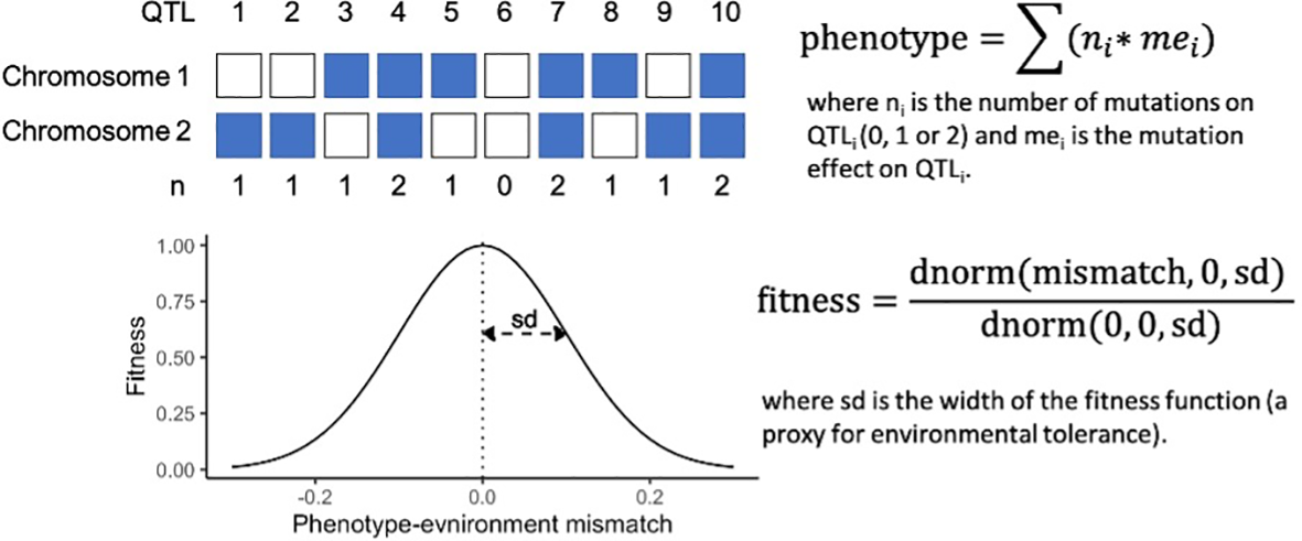 Our simulations employed a mechanistic approach of additive genetic variance to estimating quantitative trait loci (QTL)-based phenotypes and fitness. Phenotypes of individuals were calculated as the sum of the effect size of all derived alleles present in an individual at each QTL (Figure 2). The maximum phenotypic trait value was therefore maximized when an individual was homozygous for all derived alleles with a positive effect, and had no derived alleles with a negative effect. For simplicity, in this study mutation effects were kept uniformly at +0.01 except when testing the influence of the number of QTLs and hence, genetic variance on adaptive processes. Therefore, an individual homozygous at 100 QTLs had a phenotypic trait value of 2.0 (100 QTLs * 0.01 mutation effect * 2 chromosomes).