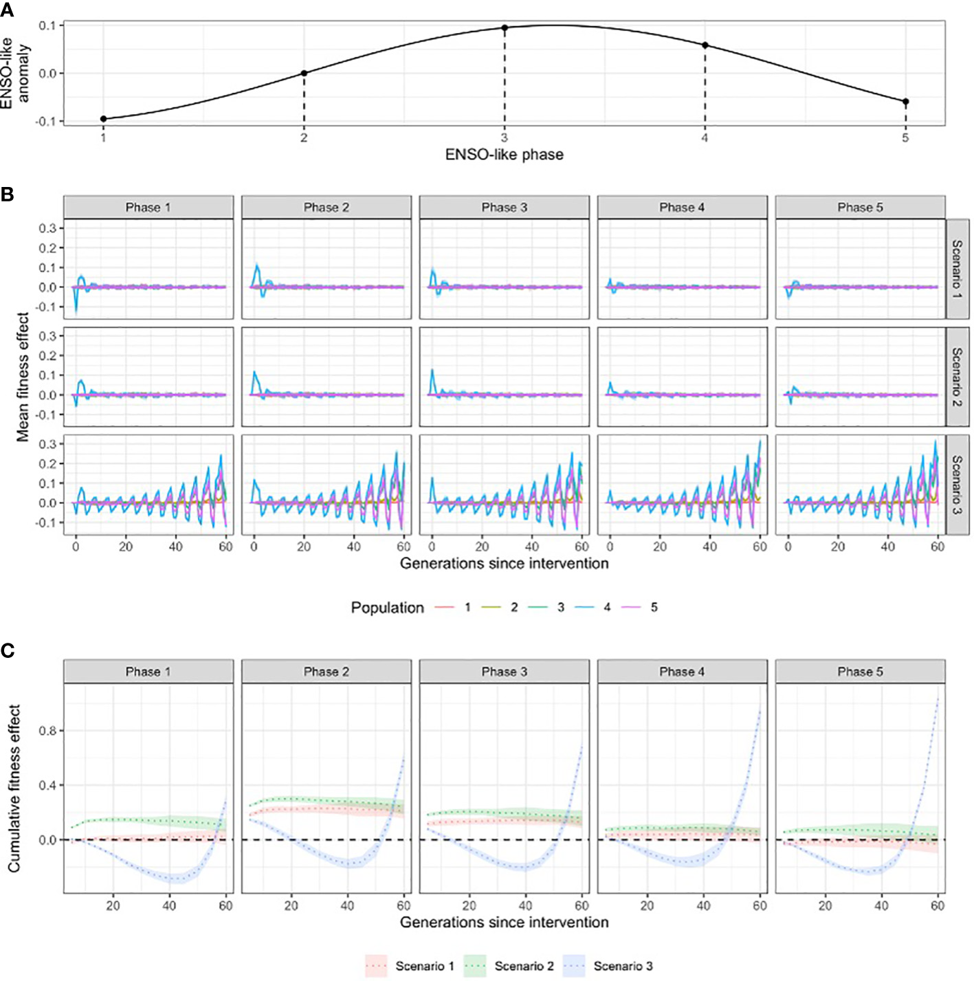 To test the effect of the timing of intervention in relation to ENSO-like environmental oscillations, we simulated interventions in five consecutive generations that represent different ENSO-like phases (Figure 3). Note that because warming was simultaneously ongoing, a slight warming signal was unavoidable in these comparisons.