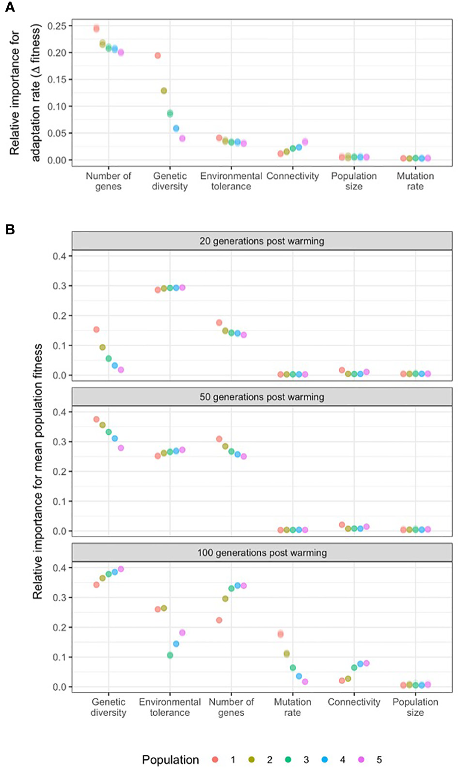 The relative importance of population genomic parameters for the (A) rate of adaptation (change in fitness in the first 20 generations of warming; and (B) mean population fitness after 20, 50 and 100 generations of warming. Relative importance of model parameters for the rate of adaptation was measured by the standard deviation (sd) of the fitness differences at the start of a 0.01°C/generation warming and 20 generations later, varying the target parameter while keeping the others constant. Relative importance of model parameters on mean population fitness was measured by the sd of the fitness values at 20, 50 and 100 generations of 0.01°C/generation warming, varying the target parameter while keeping the others constant. Populations were distributed along an environmental gradient with decreasing temperature from Population 1 to 5, and with twice as much migration from warm to cold populations than from cold to warm populations. Results for ten independent simulations are presented for each permutation of parameters as raw data (due to low within-group variability) and overlayed as points with transparency.