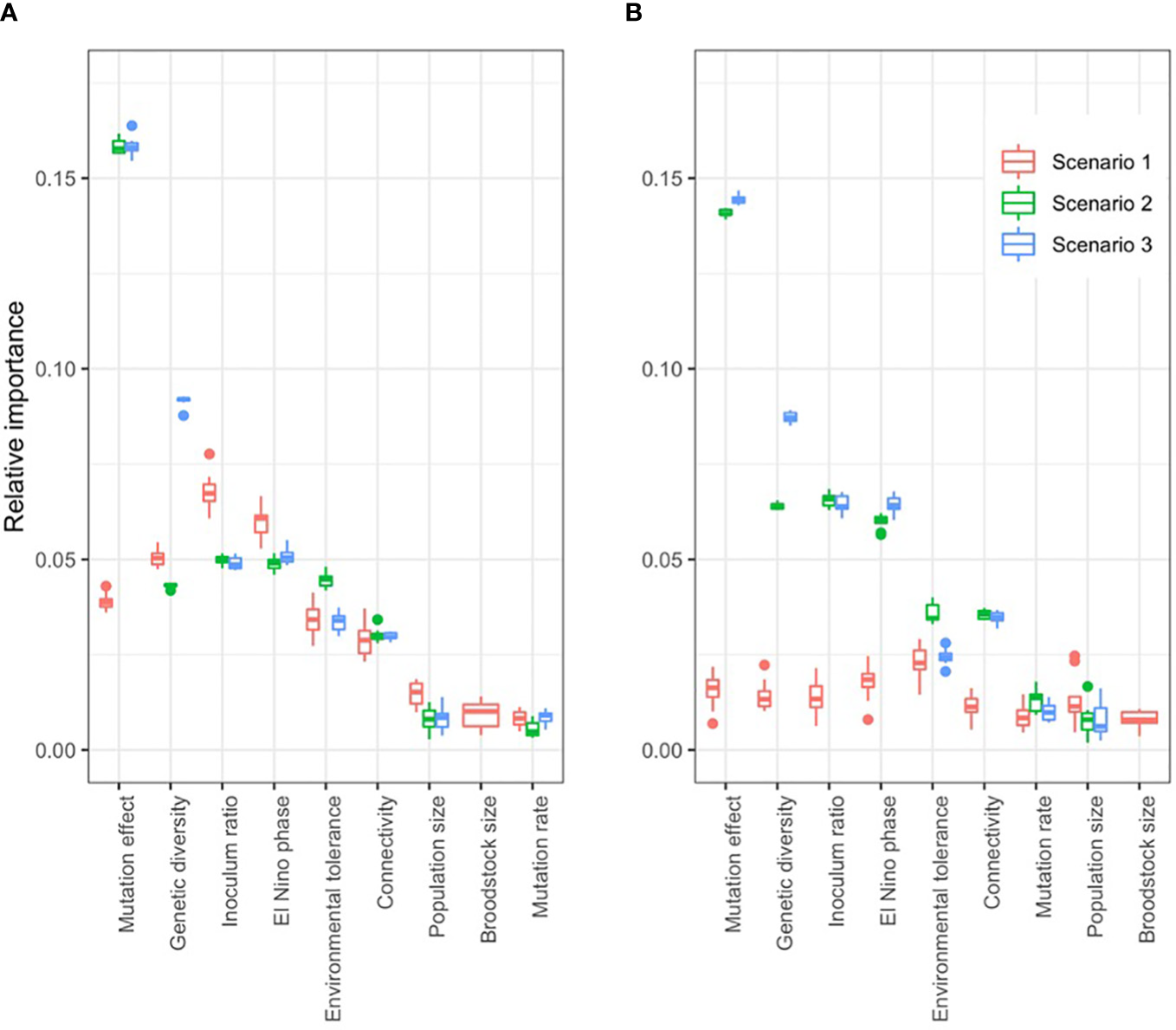 Relative importance of model parameters on the fitness effect of three intervention types: reproductively crossing extreme warm and cold populations (scenario 1), reshuffling the standing genetic variation artificially (scenario 2), or adding novel genetic variation (scenario 3). Relative importance was measured by the standard deviation of fitness effect, varying the target parameter while keeping the others constant. When the target population lies in the middle of the environmental gradient that exists along the range of the metapopulation (B), Scenario 1 (crossing warm and cold populations) has negligible fitness effect; while the same intervention in a colder population yields fitness effect (A). Boxplots show the results of ten independent simulations for each parameter combination.