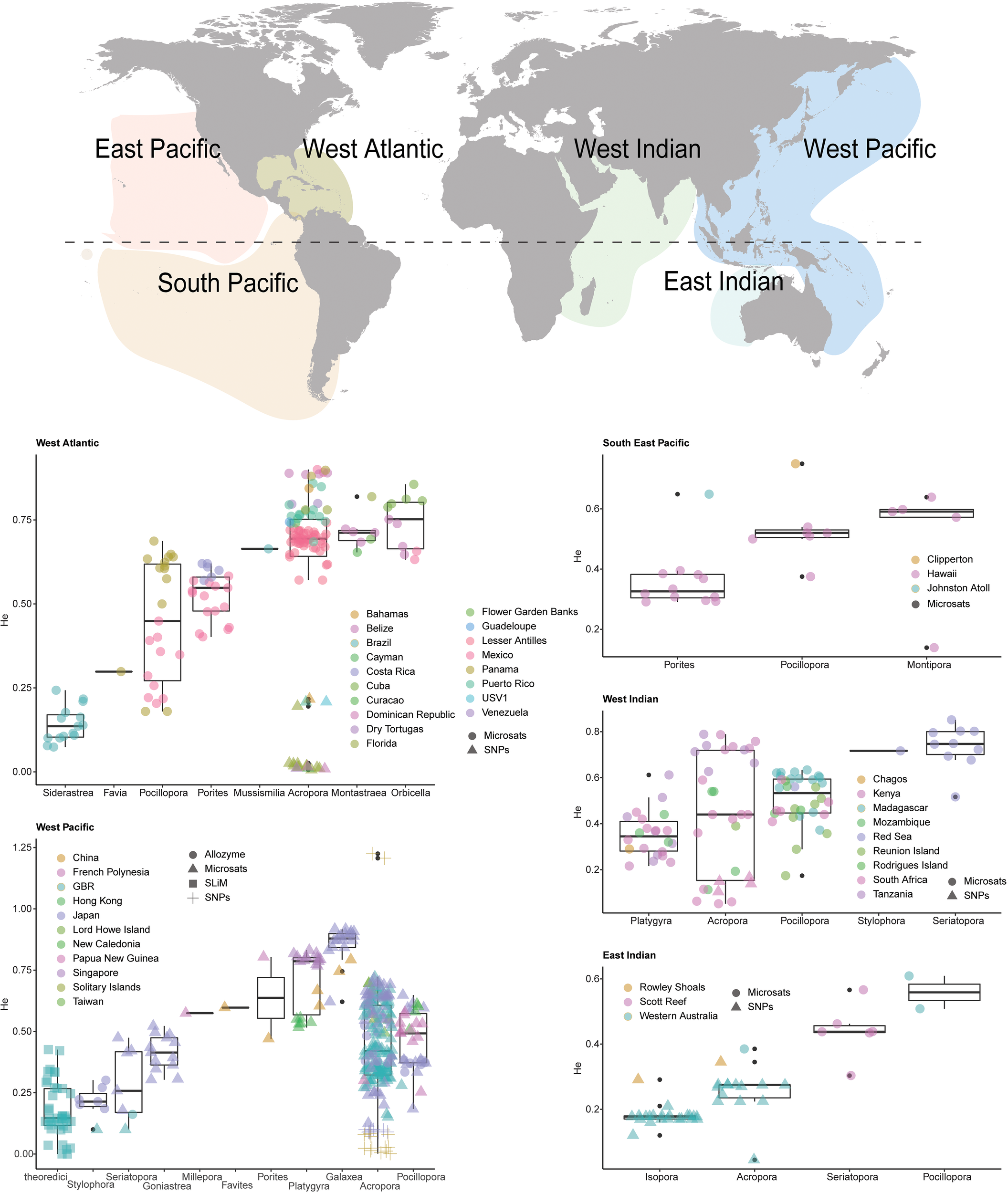 As per the theoretical population genetics literature, we predict that genetic diversity is one of the key factors defining adaptive rates and potentials in wild populations and will influence host-directed intervention outcomes when different scenarios are considered (scenarios 1-3 outlined in main text). Based on available estimates of genetic diversity, host adaptive capacity may be high (van Oppen and Medina, 2020) but a formal assessment is needed to quantify worldwide levels of diversity to better understand global potential for adaptation. Using a Web of Science search (heterozygosity AND coral, expected heterozygosity AND coral, genetic diversity AND coral (1991- 2020)), we surveyed the literature encompassing 1,150 research articles that included 51 coral species (potentially including cryptic species) from 17 coral genera across six oceanic regions. We then derived genetic diversity estimates from the alloenzyme, microsatellite and Single Nucleotide Polymorphisms (SNP) sequencing data presented in these papers and averaged by coral family and reef region. Genetic diversity here is defined as expected heterozygosity (He) across all loci, a critical measure of importance in quantifying the capacity for populations to cope with environmental variation (see Methods for further information). Given known differences in the interpretation of heterozygosity estimates among the different methods presented here (allozyme, microsatellites, genome-wide SNPs), each is shown in a different symbol, although no standardization or adjustments have been made between the three types of estimates.