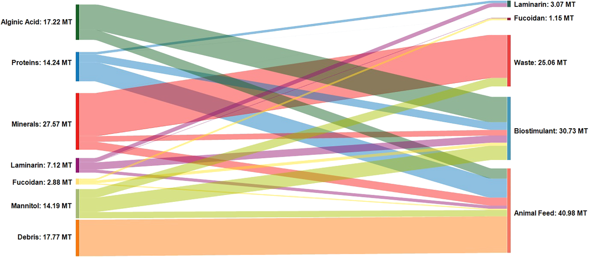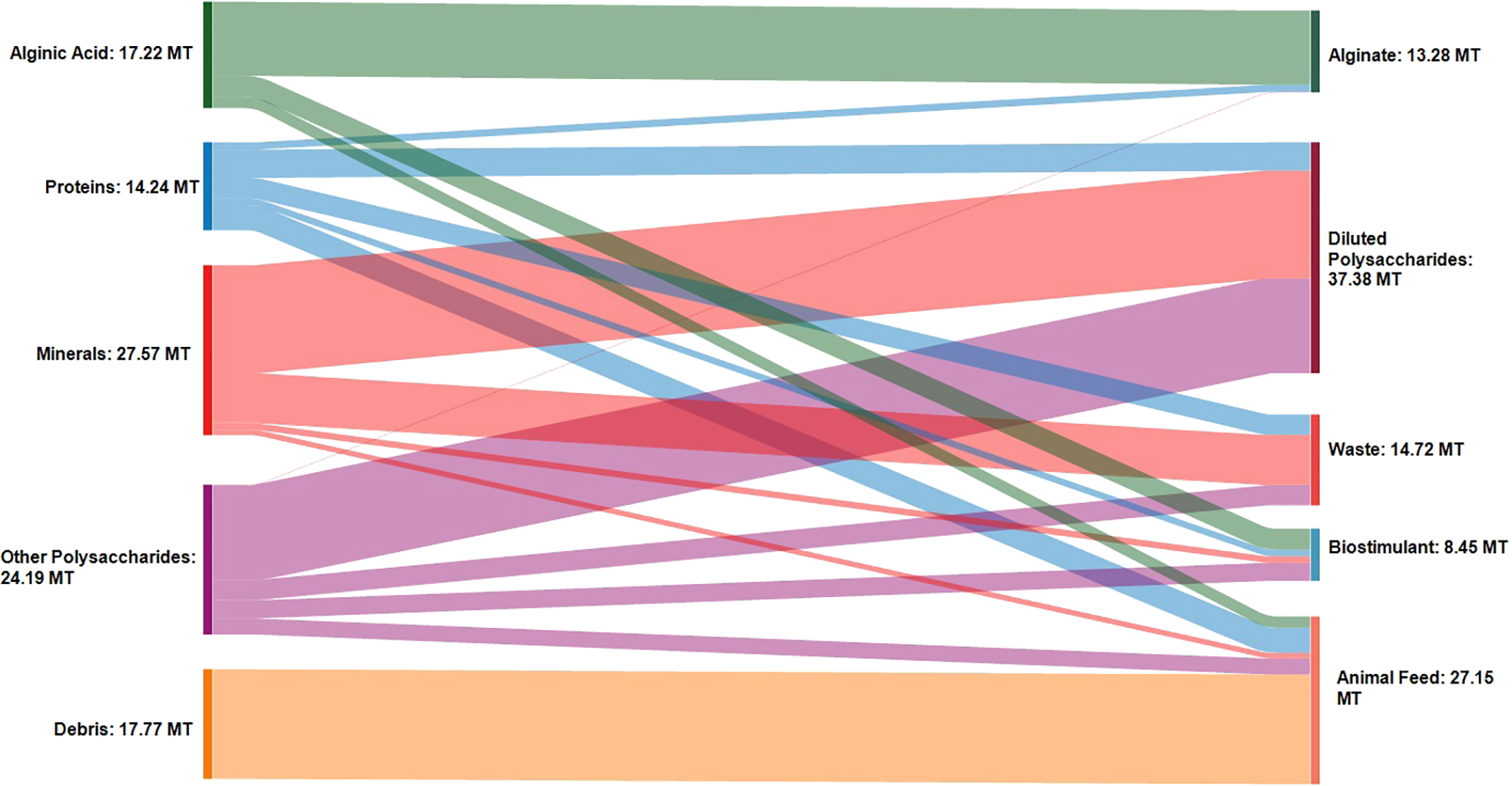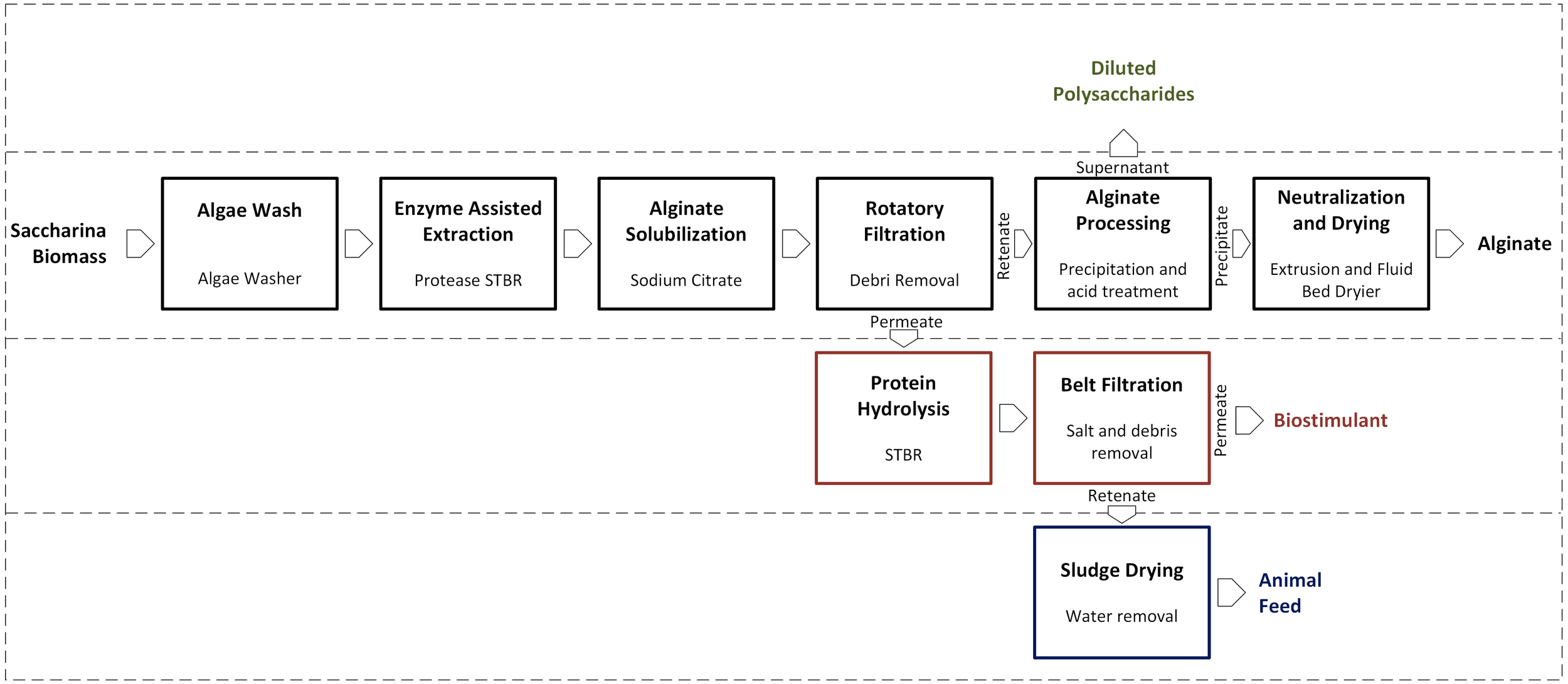 For the by-product processing, the recovered precipitated alginate is mixed with the debris left from rotatory filtration and processed into a biostimulant and feed as described previously. In this scenario, the two sub-products have higher alginate concentrations.