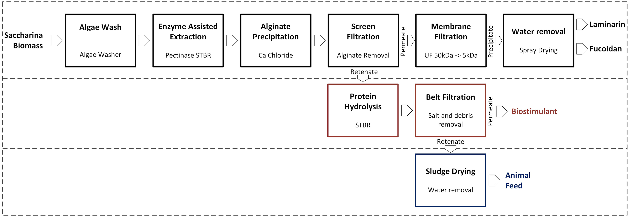 Simplified flowchart for laminarin and fucoidan production biorefinery using enzyme assisted extraction.