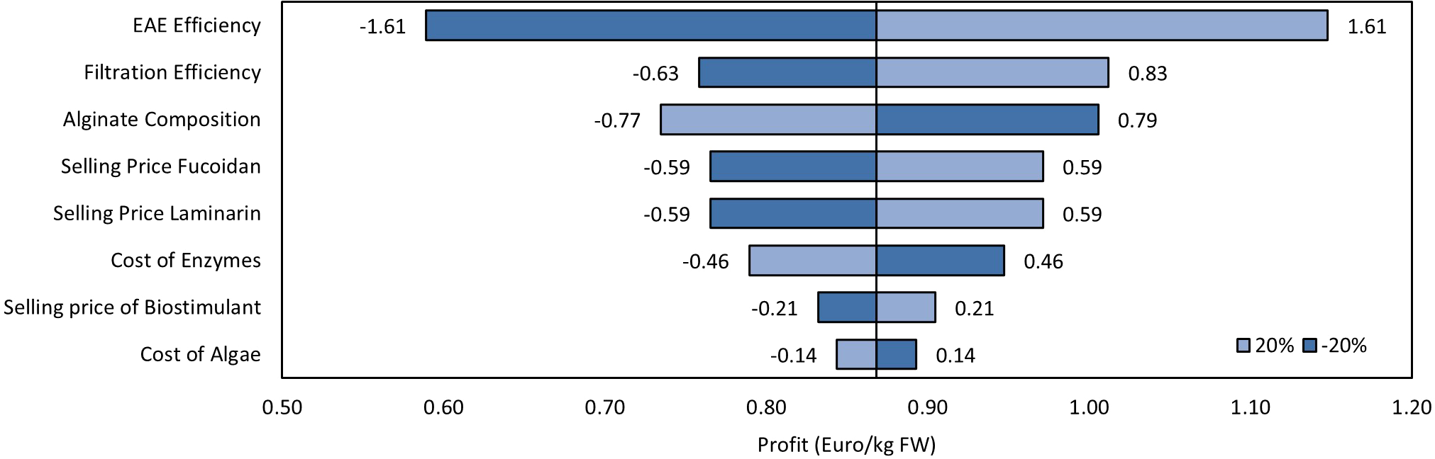 To determine the revenue, the market selling prices had to be determined and can be seen in Table 3. The selling price for alginate, laminarin, and fucoidan strongly depends on different factors, such as purity and chemical composition (the mannuronic acid: guluronic acid in alginate). The prices used for this simulation were taken from direct communication with seaweed producing companies and are within the ranges reviewed by Zhang and Thomsen (2019).