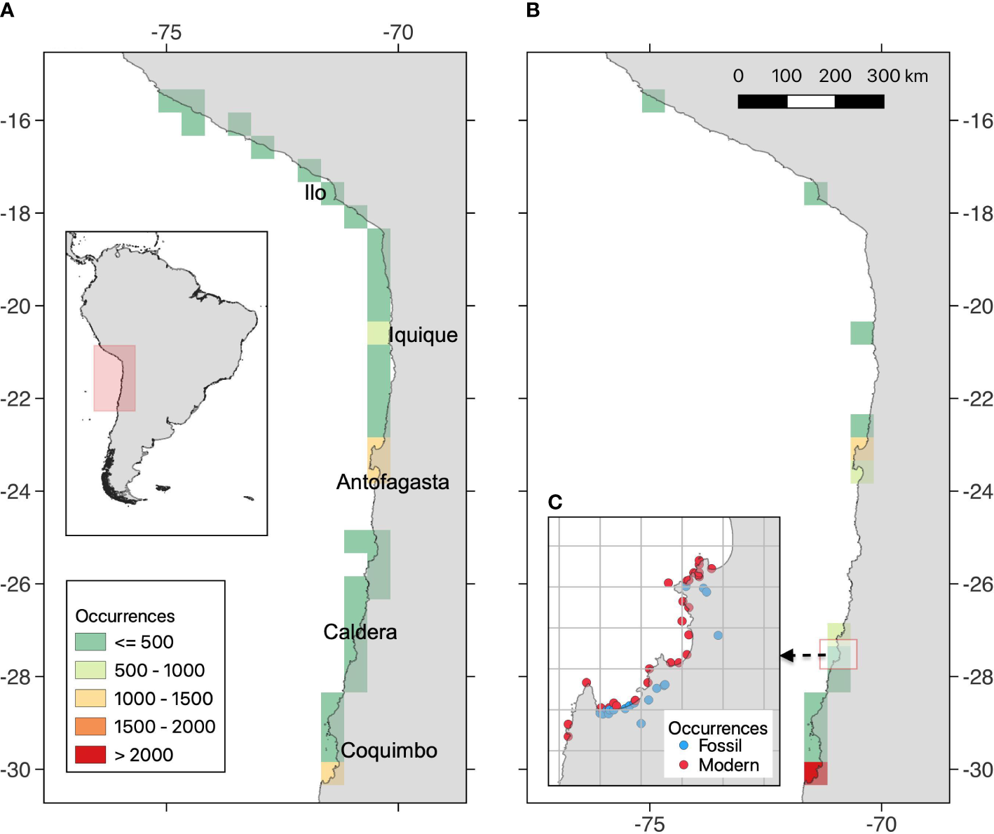 Map of the study region, in coast of the Humboldt Current Ecosystem, showing the number of georeferenced occurrences for (A) modern and (B) Quaternary fossil assemblages. It is also provided an example of the spatial aggregation scheme, using grids cells of 0.1° (C).