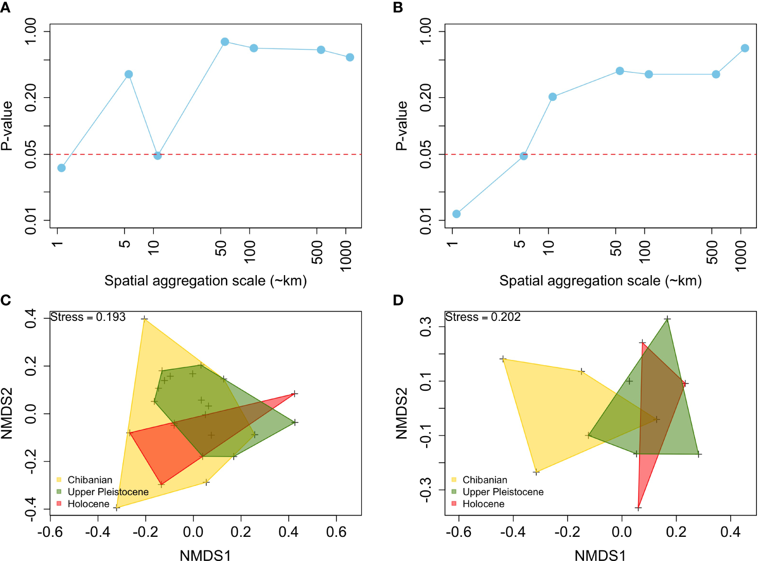 Long-term stability in the species composition of fossil assemblages, showing p-values of the permutational analysis of variance among time intervals based on the Jaccard (A) and Chao indices (B) across spatial scales of aggregation. Also shown are non-metric scaling 2-D representations of the species composition, using as an example the 10 km aggregation scale, for the Jaccard (C) and Chao indices (D).