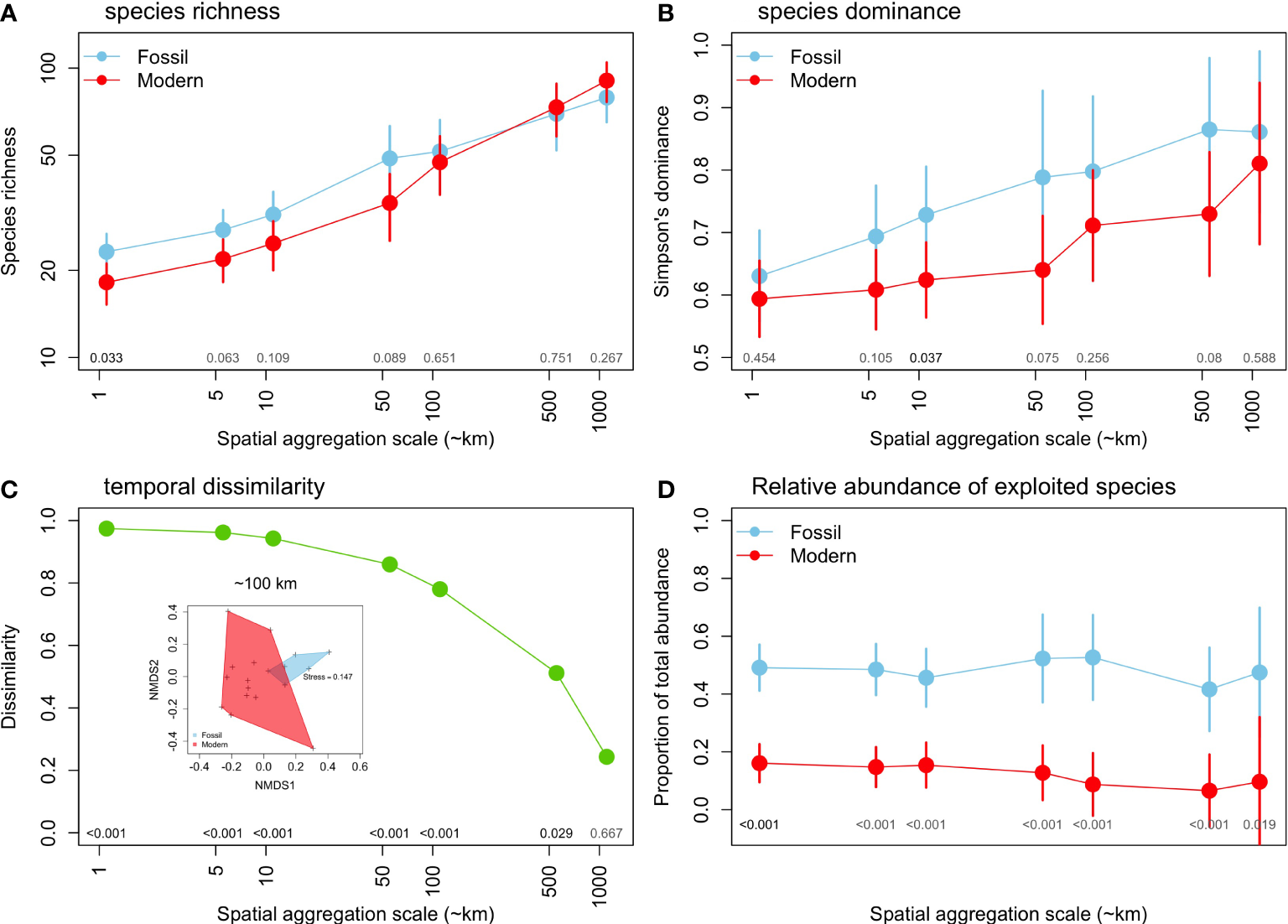 Changes in the diversity of mollusk assemblages between fossil and modern assemblages across different spatial aggregation scales: (A) coverage-based species richness, (B) species dominance (Simpson index), (C) Median dissimilarity (Chao index), with a nMDS illustrated for ~100 km aggregation scale, and d) relative abundance of exploited species. (A, C, D) based on meta-analysis mean values and 95% CIs.