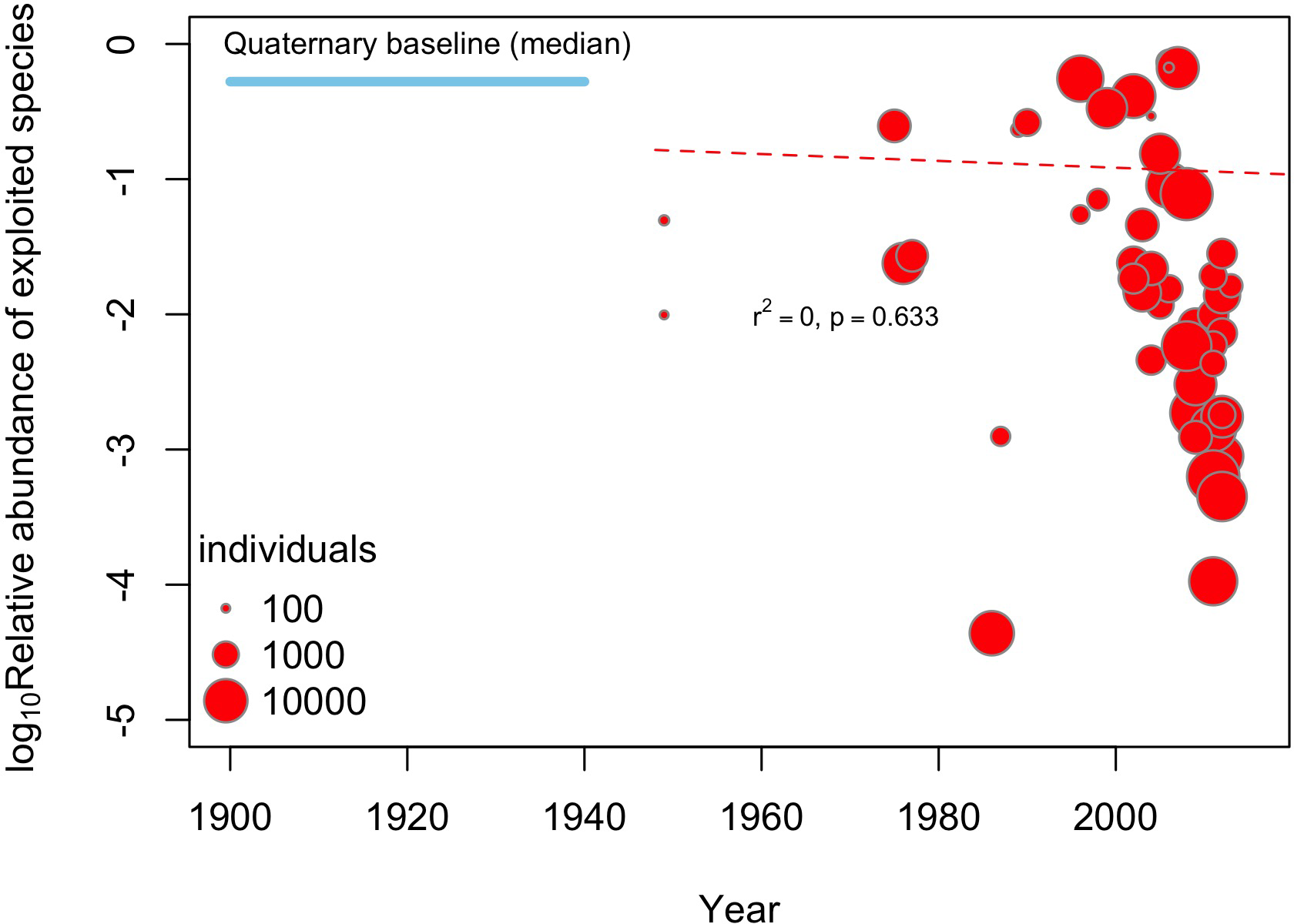 Meta-analysis testing the existence of temporal changes in the relative abundance (log10) of exploited species during the last ca. 70 years at the HCE, aggregated a scale of 1° (~100 km). The size of circles is proportional to the sampling size. The dotted red line shows the meta-regression fit line between the relative abundance and the sampling year (not significant). For comparison, the mean relative abundance of exploited species obtained for fossil assemblages at a similar spatial aggregation scale are given.