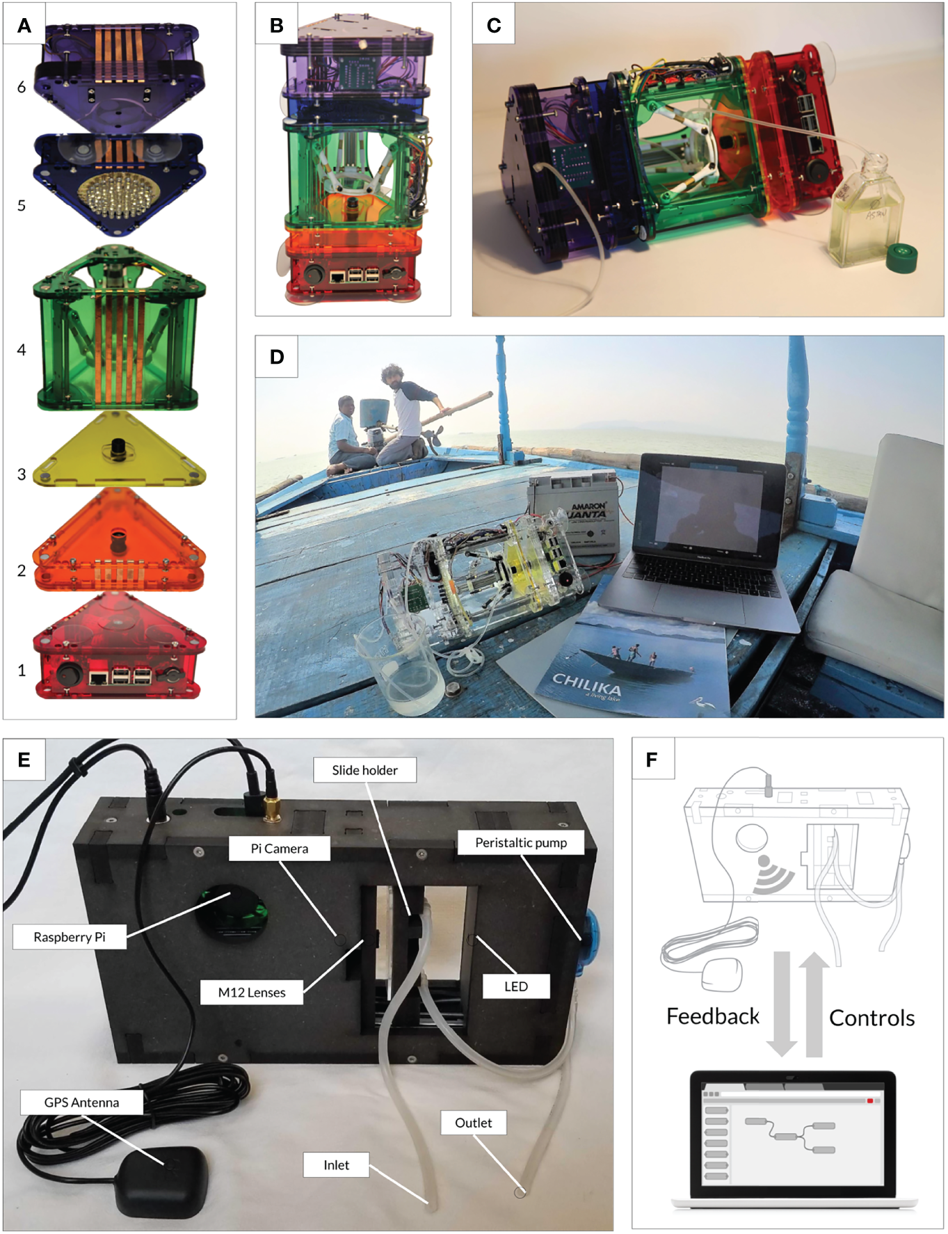Comparison of the modular (v.1) and monolithic (v.2) PlanktoScope designs. (A) Modular stackable flow-through microscope design (bottom to top): Computational/imaging sensor (1), tube lens (2), objective lens (3), delta stage for sample manipulation and focus including flow cell mount (4), illumination (5), pump (6). The platform can be re-assembled and is held together by the alignment of fixed magnets. (B) The PlanktoScope v.1 can be used in vertical configuration for static imaging or (C) horizontal configuration for flow through imaging. (D) Deployment of the PlanktoScope v.1 on board a traditional fishing boat in lake Chilika (Orissa, India), operating autonomously on a 12V car battery. (E) Monolithic portable PlanktoScope v.2 with fixed flow-through configuration. (F) PlanktoScope is controlled via smartphone or laptop allowing real-time feedback during data collection and processing.