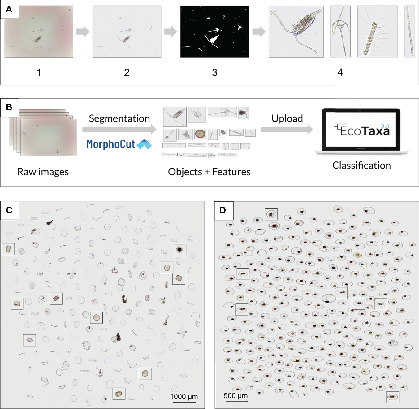 Image processing pipeline for fluidic analysis. (A) Workflow used to segment the objects imaged in a single frame and extract features. From the raw images (1) acquired in fluidic mode, MorphoCut applies a running median to approximate the background image (2) based on 5 frames; using OpenCV, a Canny Edge Detection is performed, followed by dilation, closing, and erosion functions (3); from the binary image, MorphoCut extracts the vignette/ROI for each object (4), together with a suite of mathematical image descriptors. (B) The Raw images and segments from MorphoCut along with the objects and a table containing all the measured features/metadata can then be directly uploaded on EcoTaxa for classification. (C) and (D) Non-destructive continuous monitoring of lab cultures using a PlanktoScope allows for cell morphology to be observed at single-cell resolution. (C)Coscinodiscus wailesii cultures were monitored over a period of 6 hours. Simple montages allow the user to easily quantify living or dead cells at different time points. (D)Pyrocystis noctiluca cultures were monitored over a period of 6 hours during their night-to-day transition. Dividing cells are easily identifiable.