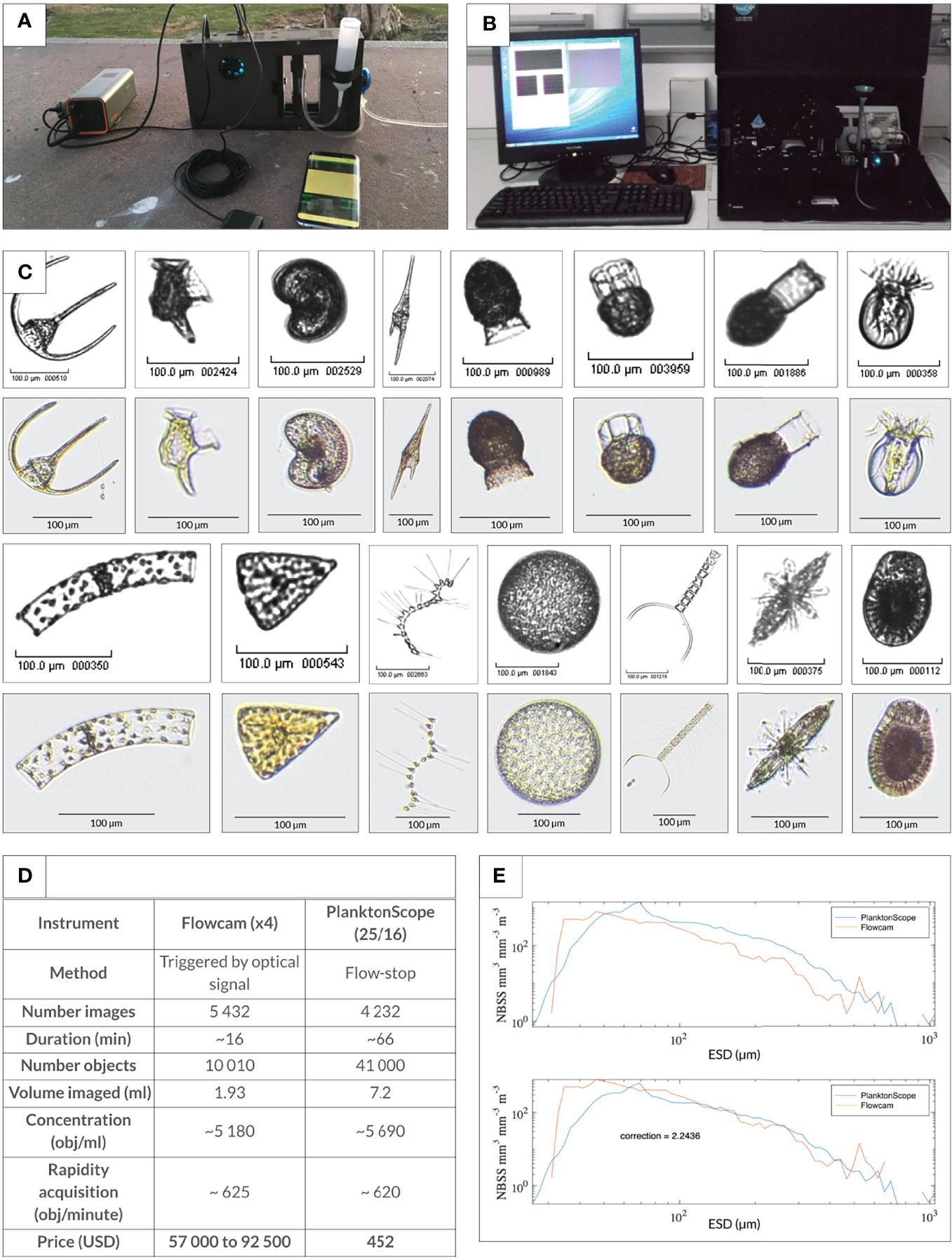 One-to-one comparison of PlanktoScope with the Flowcam. (A) Ultra-portable configuration of the PlanktoScope operated on a cell phone charger and controlled through a user interface on a smartphone. (B) Typical setup of a FlowCam on a laboratory bench. (C) One-to-one comparison of the same sample (plankton tow, Villefranche/Mer, France) passed through a PlanktoScope and Flowcam (version Benchtop B2 Series). Representative images were chosen from the two data sets (monochromatic images, Flowcam; color images, PlanktoScope) - first row from left to right: Ceratium spp., Dinophysis caudata, Peridiniales spp., Ceratium furca, Codonaria spp., Dictyocysta spp., Codonellopsis spp., Undellidae spp. Second row from left to right: Guinardia spp., Licmophora spp., Asterionellopsis spp., Coscinodiscophyceae spp., Chaetoceros spp., Acantharea, unknown sp. (D) Table comparing efficiencies for both trigger-based optical image collection (Flowcam) and flow-stop based wide field of view imaging and computational segmentation (PlanktoScope). When normalized for the total number of objects detected, PlanktoScope performed equally well compared to FlowCam. (E) Comparison of total planktonic organisms (objects) sampled with different collection methods and analyzed with different optical/imaging methods as a function of the size of organisms (expressed as equivalent spherical diameter; ESD). Total organism biovolume per size class was expressed as Normalized Biovolume Size Spectra (NBSS) by dividing the total biovolume within a size class by the biovolume interval of the considered size class. NBSS is representative of the number of organisms within a size class. The same plankton net sample was run through a Flowcam and a PlanktoScope v.2. All data are raw counts and converted to biovolume using ellipsoidal calculations. The low count at the smaller size range of each observation corresponds to an underestimation of an object’s number due to both the limited capabilities of each imaging device for small objects and net under sampling for small objects utilizing the plankton tow.