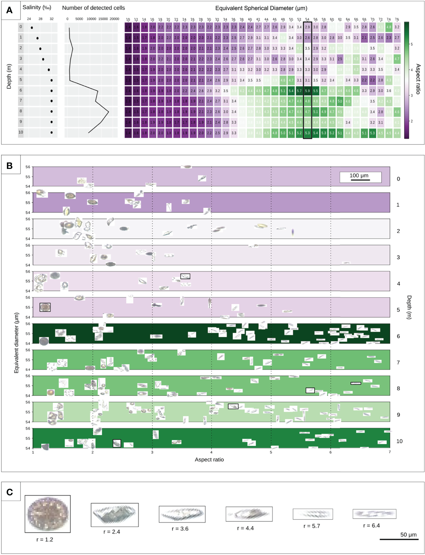 PlanktoScope assessment of micro-plankton biodiversity along a vertical gradient in a Chilean fjord. (A) The extreme salinity gradient was measured in the Patagonian Comau fjord. Using sampling at discrete depths and the PlanktoScope, we attempted to describe correlations between salinity and plankton abundance/morphology across depths. Samples were collected with a Niskin bottle at different depths and imaged under a PlanktoScope. The plot depicts a vertical snapshot of an ecosystem from 0m (surface water) to 10m (depth) with the number of identified objects and equivalent diameter (10 to 76 μm) as a function of depth (0 to 10m). The measurement of the elongation per equivalent diameter is based on 94,262 objects detected in total. Color bar represents the aspect ratio from purple (small aspect ratio) to green (large aspect ratio). (B) Display of distribution of objects with a mean size of 54 μm as a function of aspect ratio, equivalent diameter, and depths (0 to 10m). (C) Illustration of objects with a gradual aspect ratio from 1.2 to 6.4 marked in (B).