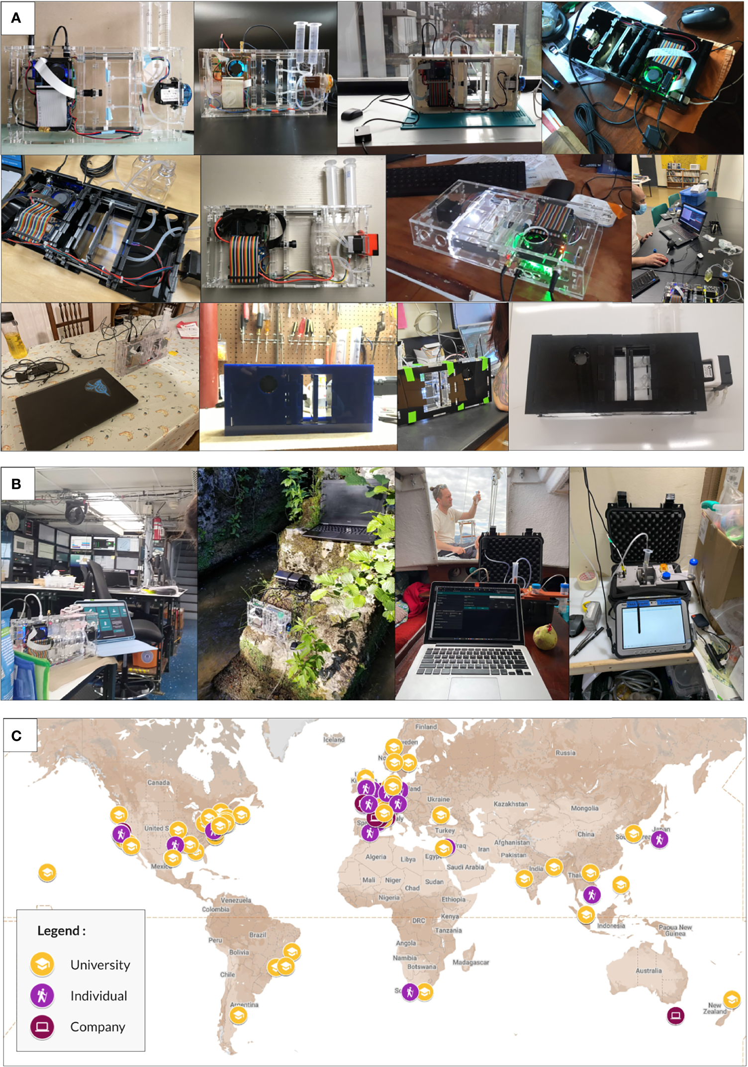Documenting community replication of the Planktoscope. (A) Images of Planktoscopes built and implemented by the community from 2020-2021. First row (left to right), built by: Salima Rafai, Laboratoire Interdisciplinaire de Physique, CNRS - Université Grenoble Alpes; Guillaume Le Guen. Konk Ar Lab, Le Temps des Sciences and Saint Brieuc Factory; Ana Fernandez Carrera, Biological Oceanography, Leibniz Institute for Baltic Sea Research Warnemünde (IOW); Dyche Mullins, Mullins Lab, University of California - Second row (left to right): Andrian Gajigan, School of Ocean and Earth Science and Technology, the University of Hawaii at Manoa; Bronwyn Lira Dyson, Experimental Limnology, Leibniz Institute of Freshwater Ecology and Inland Fisheries (IGB); Guillaume Bourdin, School of Marine Sciences, University of Maine; PlanktoSquad, Dalhousie University - Third row (left to right): Stewart Plaistow, Institute of Integrative Biology, University of Liverpool; Alex Barth, Department of Biological Sciences, University of South Carolina; Macci Wigginton, Ocean & Earth Sciences, Old Dominion University; Yefim Radomyselskiy, Department of Physics, City University of New York - Queens College. (B) Field deployments of the Planktoscope by community members. From left to right: v.2 on a NSF science-cruise in 2021; v.2 by a river bed in Northwest France; v.2.5 onboard Tara during a cross Atlantic cruise (see Mériguet et al. this issue); v2.5 on a small sailboat off the coast of Southeast France. (C) Planktoscope community across the world as of December 2021.
