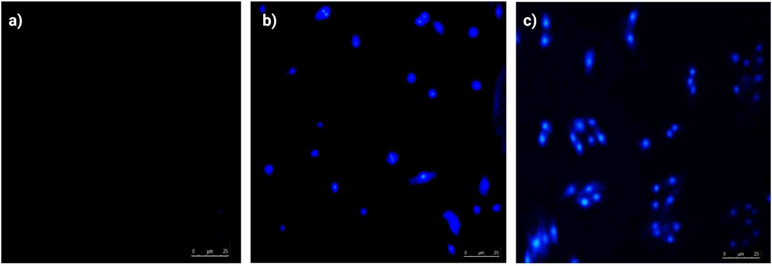 Apoptotic morphological evaluation of SK-BR-3 cells by DAPI staining (inverted fluorescence microscopy, 200x). (A) Control group, Healthy SK-BR-3 cancerous cells without blue fluorescence, (B) Treatment with ethyl acetate extract of Spirastrella pachyspira (10 μg/ml) and (C) Treatment with ethyl acetate extract of Spirastrella pachyspira (30 μg/ml), showed condensed and fragmented apoptotic bodies with blue fluorescence and nuclear or chromatin condensation.