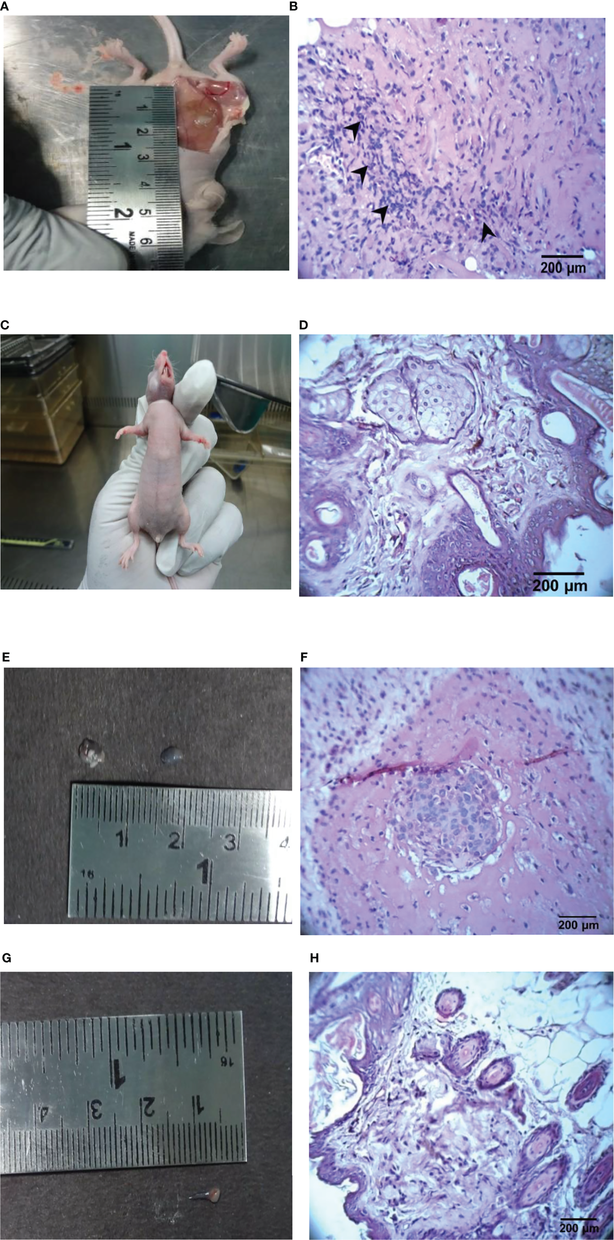 Representative images of the control, ethyl acetate extract, doxorubicin-treated tumor and its histopathology findings in athymic mice. (A) Control mice with vehicle, (B) Control mice tumor (H & E, 400 X), (C) Doxorubicin-treated (1 mg/kg), (D) Doxorubicin-treated skin (H & E, 400X), (E) Ethyl acetate extract-treated (100 mg/kg b.wt.), (F) Ethyl acetate extract of Spirastrella pachyspira-treated (100 mg/kg b.wt.) (H & E, 400 X), (G) Ethyl acetate extract of Spirastrella pachyspira-treated (200 mg/kg b.wt.), (H) Ethyl acetate extract of Spirastrella pachyspira-treated (200 mg/kg b.wt.) (H & E, 400 X).