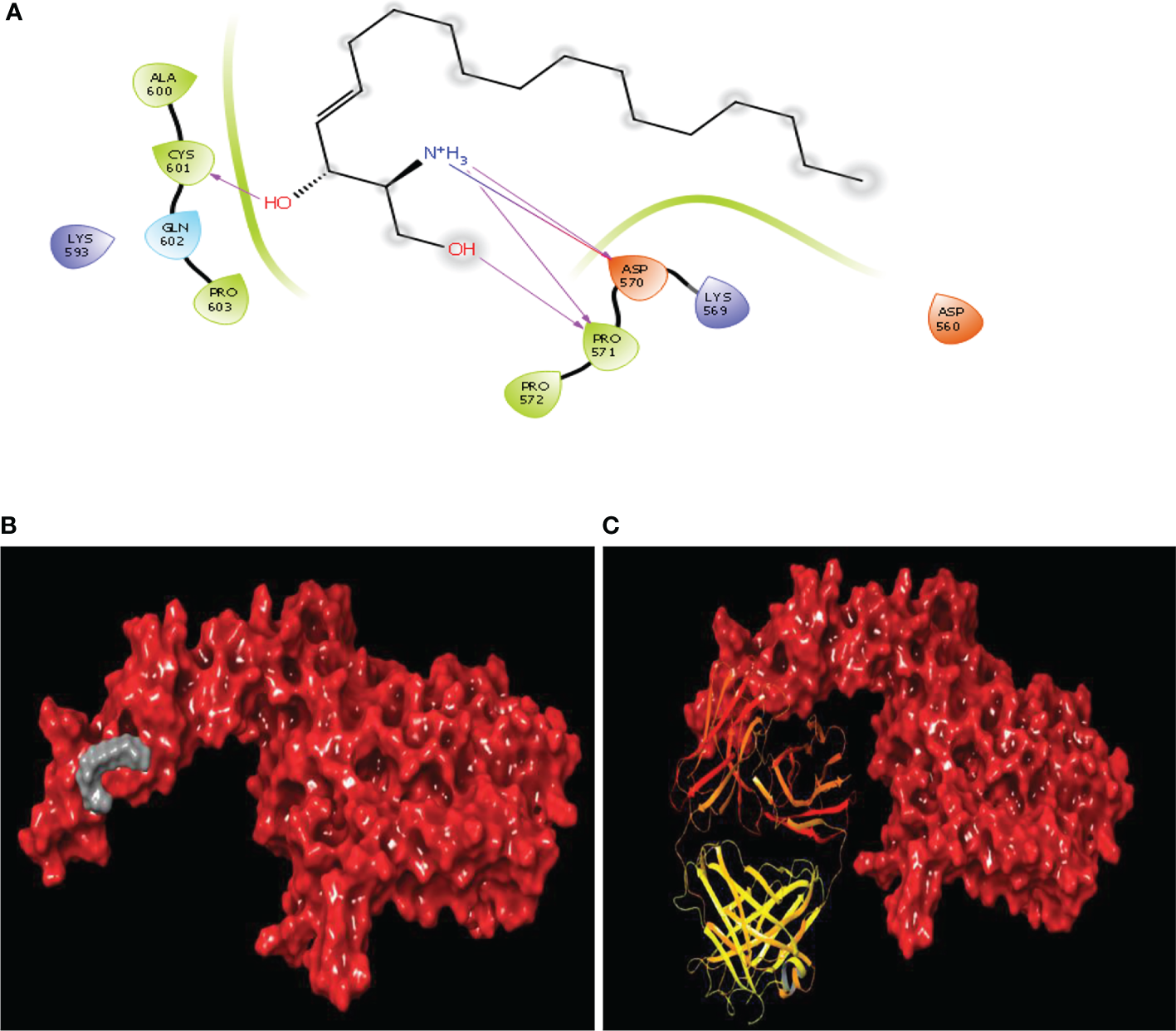 Binding site similarity of sphingosine and trastuzumab (A) interaction of sphingosine with extracellular site of HER2 (B) Binding pattern of sphingosine with extracellular pocket of HER2 (C) binding pattern of trastuzumab with extracellular pocket of HER2.