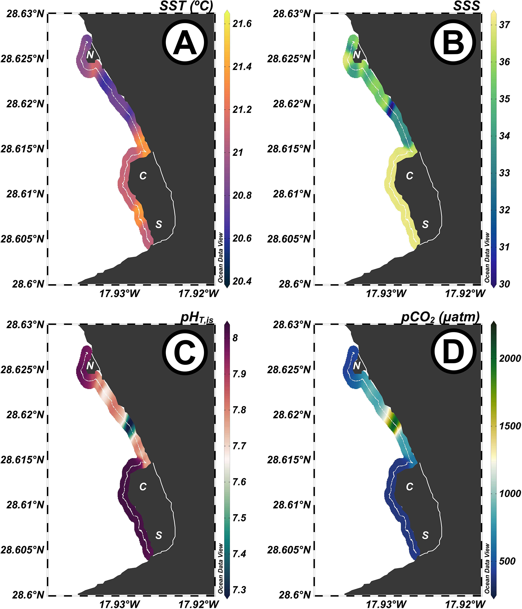 Surface distribution of (A) temperature (SST, °C), (B) salinity (SSS), (C) pH in total scale at in-situ conditions (pHT,is), and (D) partial pressure of CO2 (pCO2, µatm) along the new shoreline with the two new formed deltas (approximated shape) in the coast of Tazacorte, La Palma during 11th January 2022, 1 month after the emission of lava finalized. North (N), center (C), and south (S) correspond with the locations of the pre-lava arrival stations.