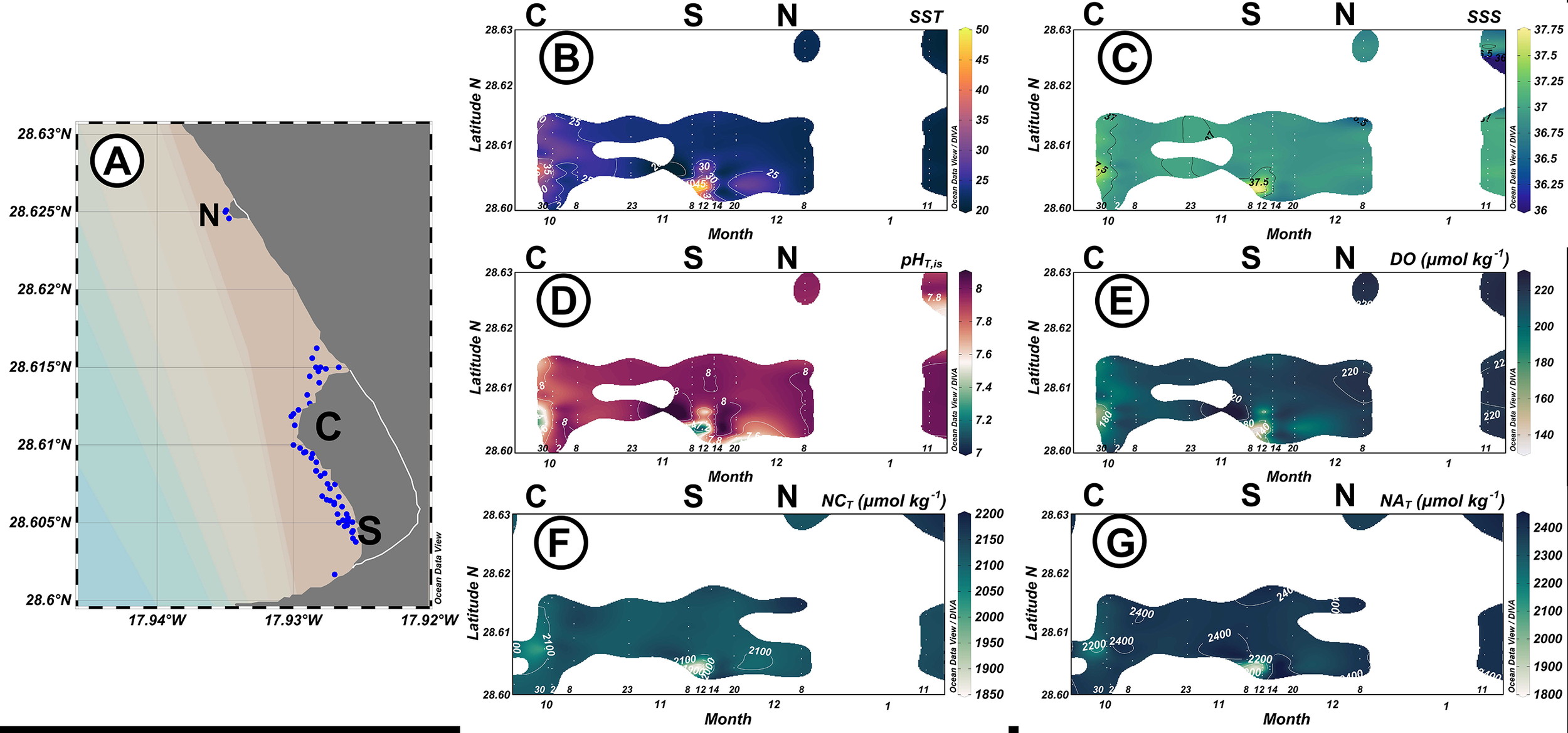 (A) Map of the coast of Tazacorte with the newly gained shoreline delimited with the white line. Blue dots correspond to the sampling stations. North (N), center (C), and south (S) correspond with the locations of the pre-lava arrival stations. Surface seawater properties of (B) temperature (SST in °C), (C) salinity (SSS), (D) pH in total scale at in-situ conditions (pHT,is), (E) dissolved oxygen concentration (DO, µmol kg−1), (F) normalized to a constant salinity of 37 CT (NCT, µmol kg−1), and (G) normalized to a constant salinity of 37 AT, (NAT, µmol kg−1) from 22nd September 2021 to 11th January 2022 at a distance of 15–25 m from the two formed deltas at the coast of Tazacorte, La Palma. C, S, and N correspond to the arrival of lava to the respective originally sampled stations at those dates.