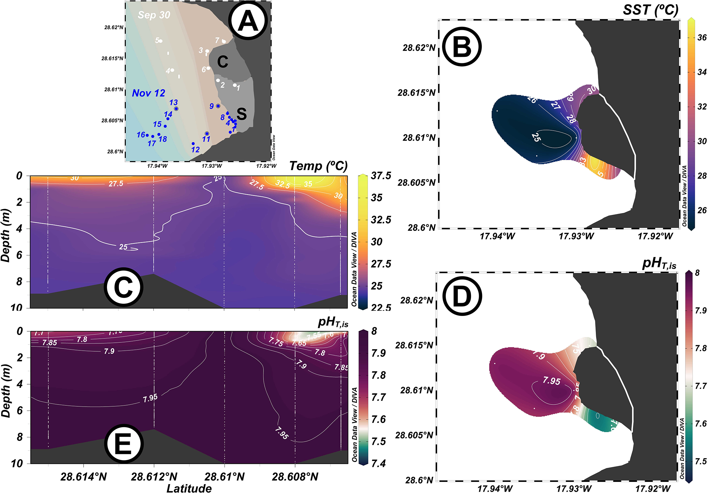 (A) Map of the sampling stations at the south delta covering original station C (Figure 1C) visited during September 30th (white dots). Sampling stations during November 12th (dark blue dots) are also included. Surface (B, D) and vertical (C, E) plots of temperature (Temp, B, C) and pHT,is(D, E) along the first formed delta.