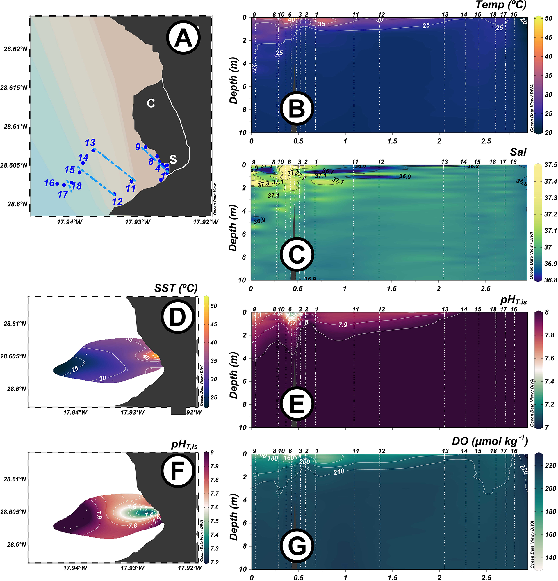 (A) Map of the sampling stations at the south delta during November 12th (dark blue dots), 2 days after the second lava–seawater event took place. Dotted lines represent transects considered in the proton balance calculation. Vertical distributions of temperature Temp, (B), salinity Sal, (C), pH in total scale pHT,is, (E), and dissolved oxygen DO, (G) along the frontal section (stations 1–9) and along the surrounding waters (stations 10–18) and surface plots of temperature SST, (D) and pHT,is(F).