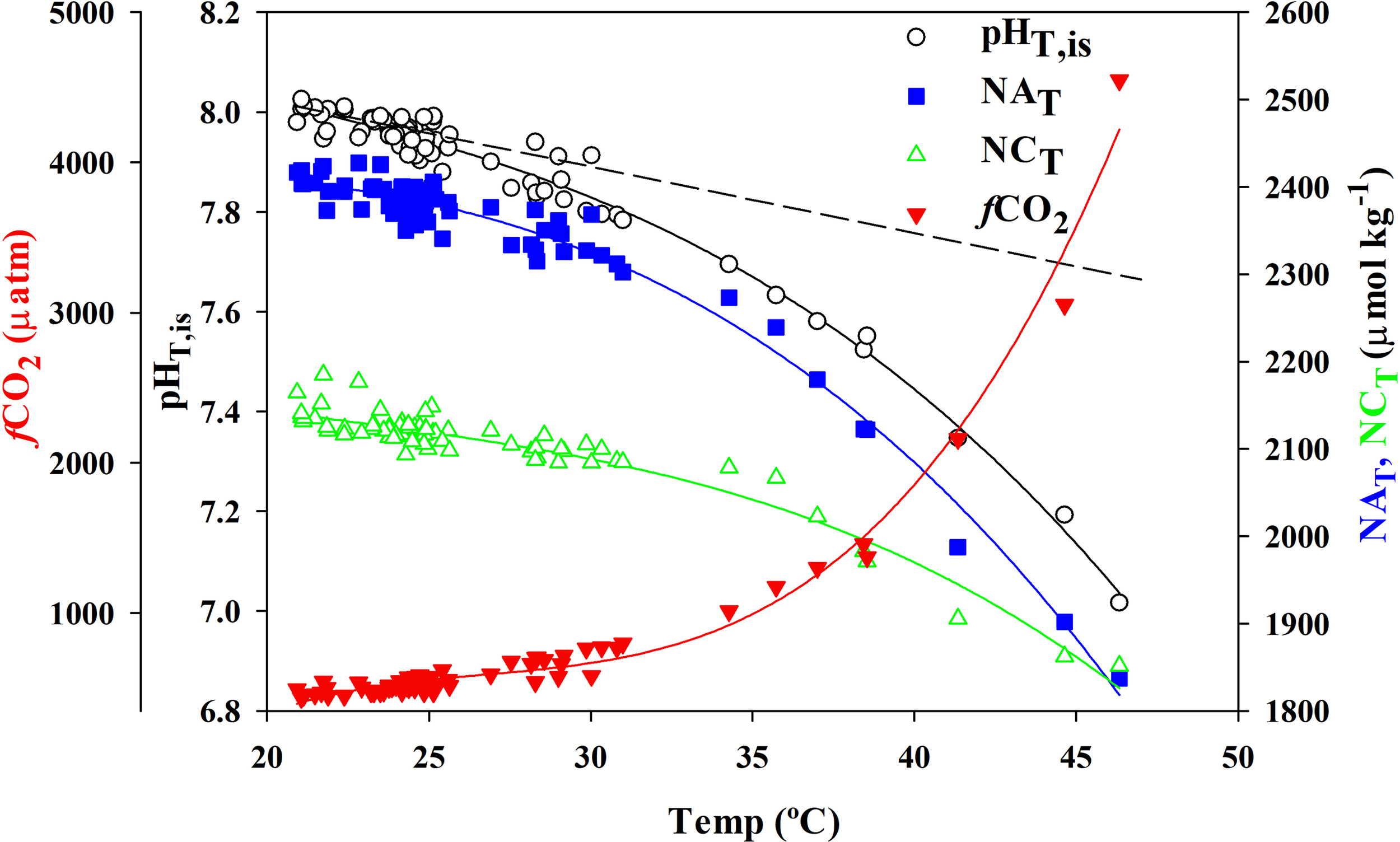 Relationship with temperature for pHT,is (black open dots), normalized to a constant salinity of 37 for AT (NAT, blue squares) and CT (NCT, green open triangles), and fCO2 (red triangles). Lines represent the third-degree polynomial fitting of the data. The black dashed line is the expected pH dependence with temperature (Takahashi et al., 1993).
