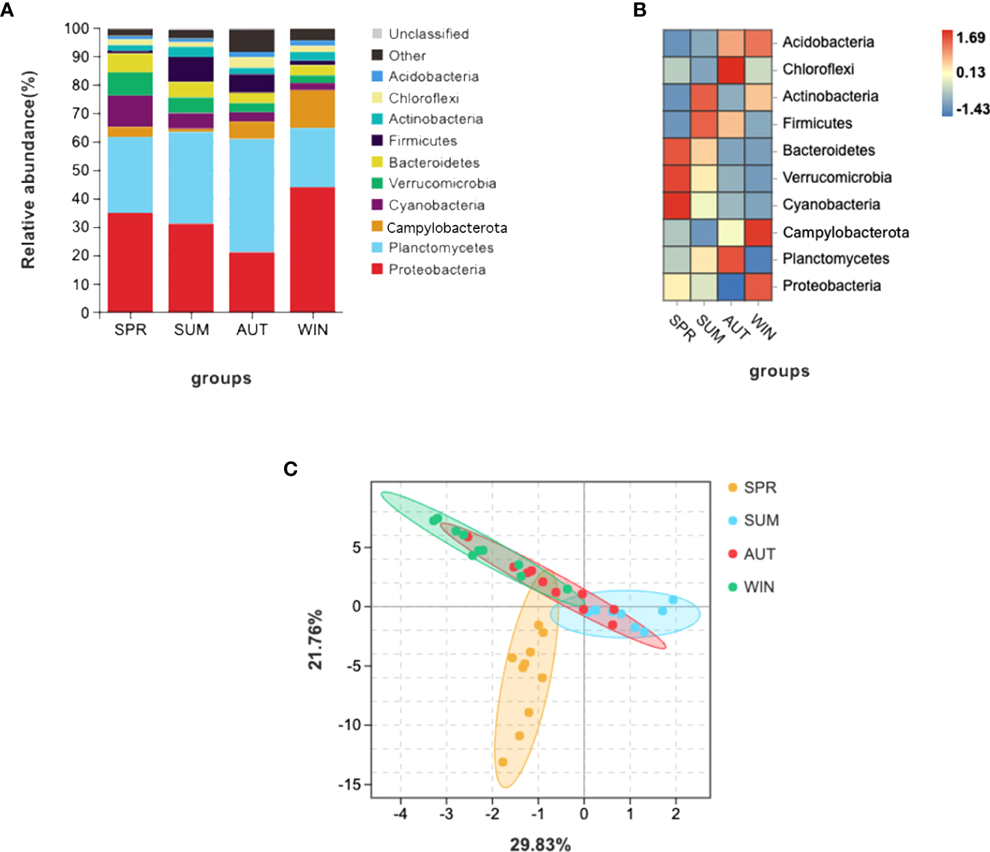 16S RNA summary and principal component analysis (PCA) of gut microbiota in A. japonicus. (A) Relative abundance (%) of the main phyla in the gut microbiota. (B) Heatmap showing the dynamic abundance of gut microbiota from A. japonicus across different seasons. (C) PCA of OTU levels.