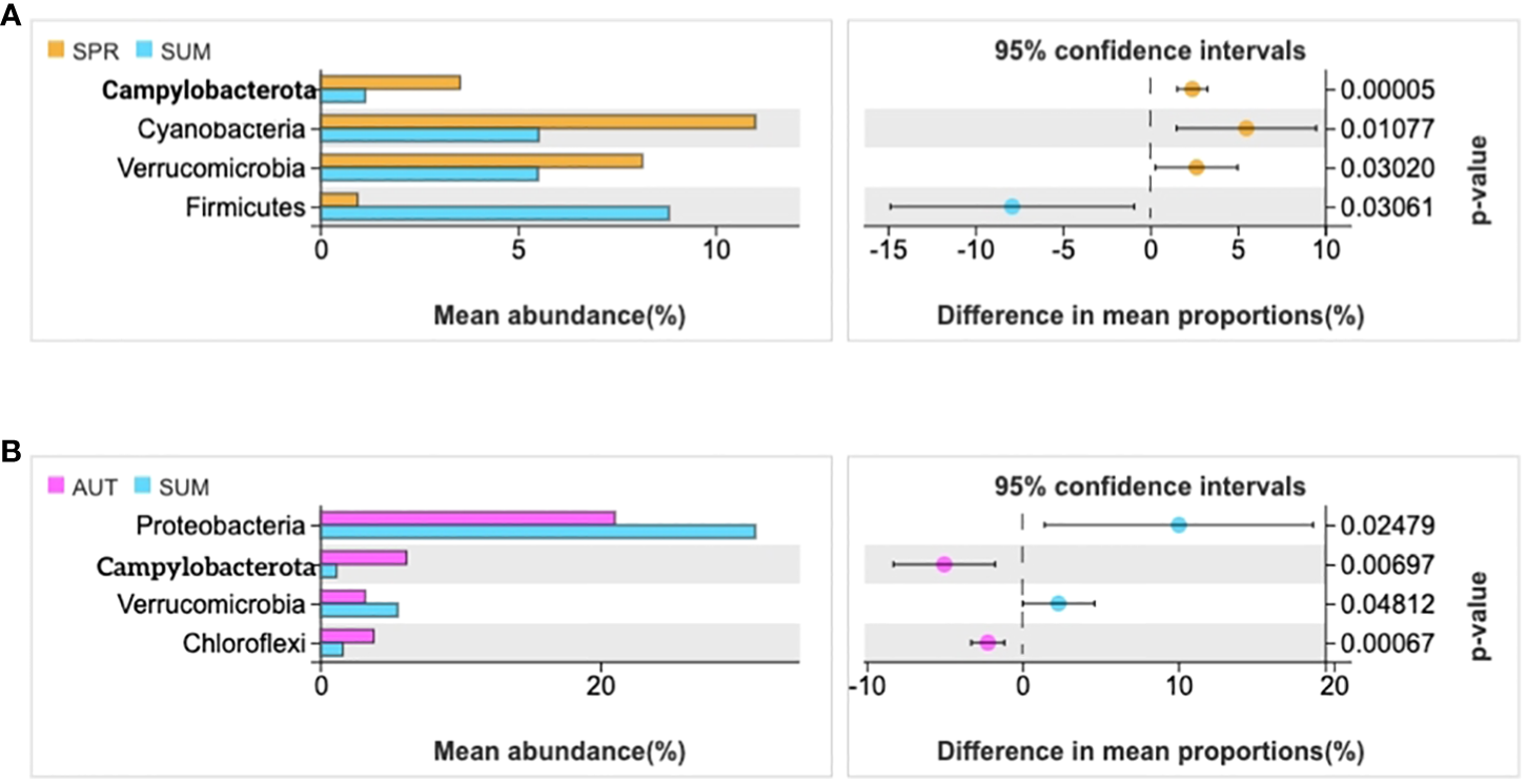 Statistical examination of intestinal microbial diversity of A. japonicus across different seasons (P ≤ 0.05). (A) the statistical examination between spring and summer. (B) the statistical examination between summer and autumn.