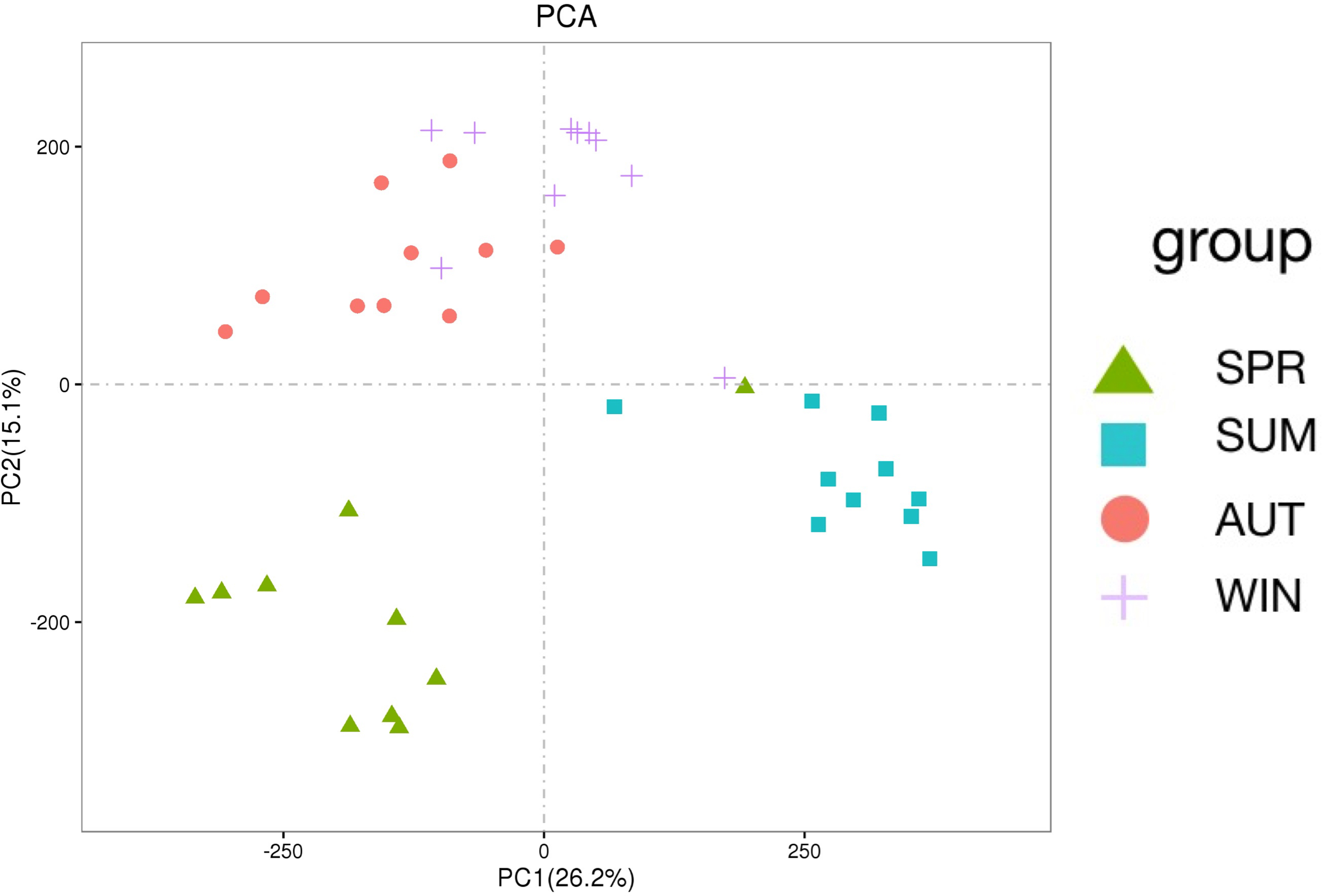 PCA shows the diversity analyses of metabolites across different seasons.