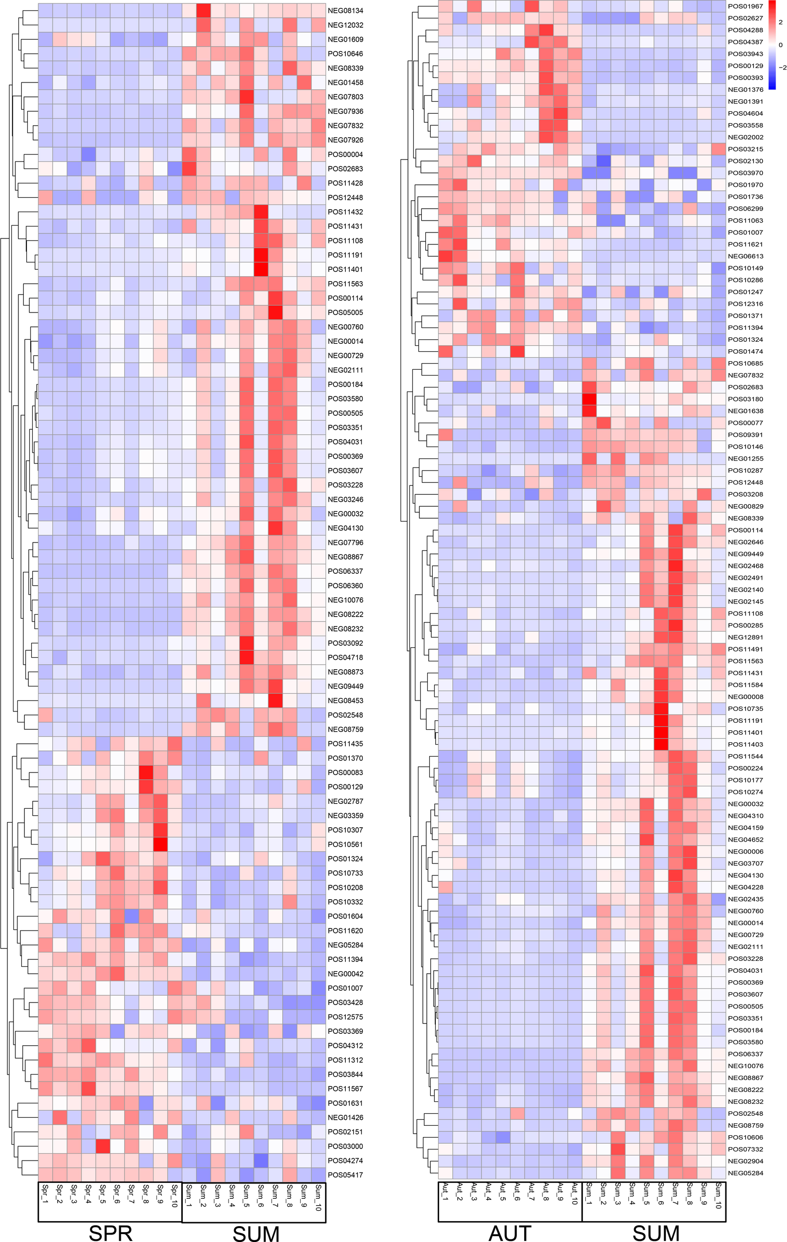 Partial metabolite heatmap of A. japonicus across different seasons between spring and summer (left), between autumn and summer (right).