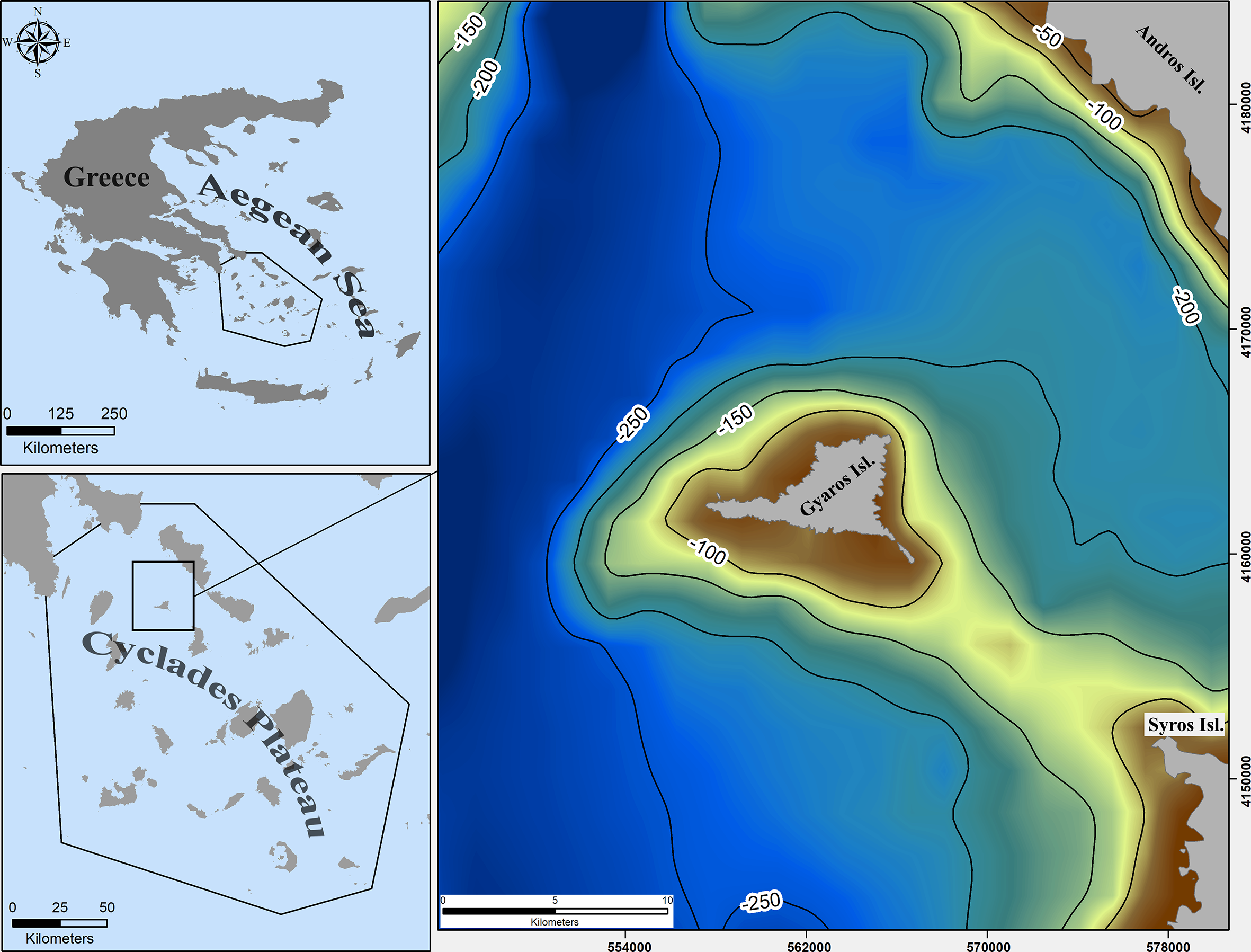 Gyaros Island location in the Cyclades plateau and the general bathymetry of the area.