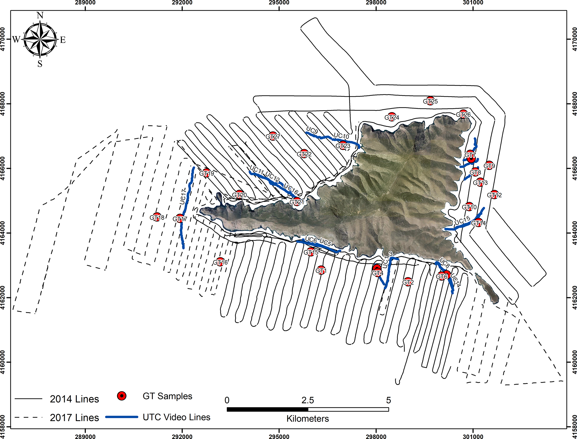 Map of the remote sensing and underwater video track lines and ground-truthing sample location.