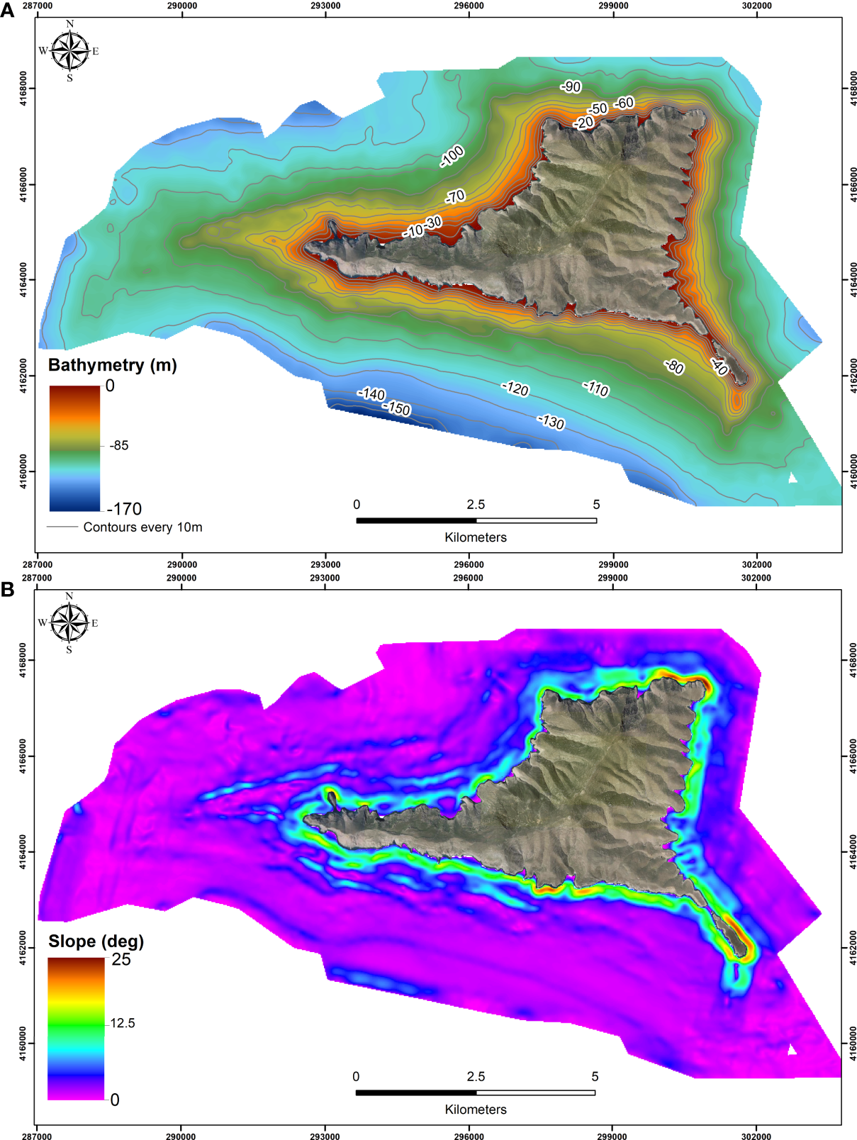 (A) Digital Elevation Model bathymetric model and (B) the slope map of the area.