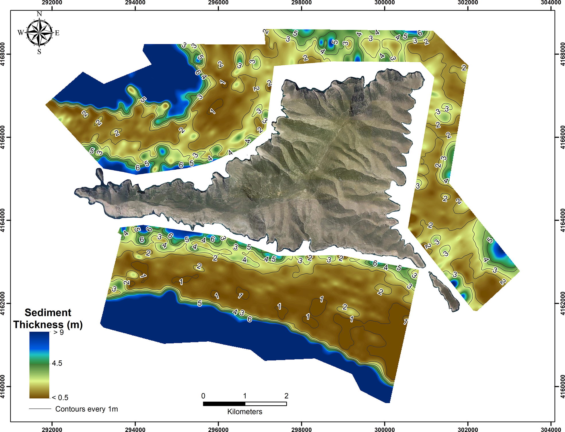 The area was segmented into two zones; the first consisted of the eastern and northern parts of the island, and the second comprised the south and western parts. In the first area, the lines were conducted parallel to the shoreline, with the distance between them being 350 m. At the second area, the lines were conducted perpendicular to the shoreline and the distance between them was 250 m. Furthermore, in order to cover the very shallow areas (less than 10 m), additional parallel lines to the island’s shoreline were conducted.