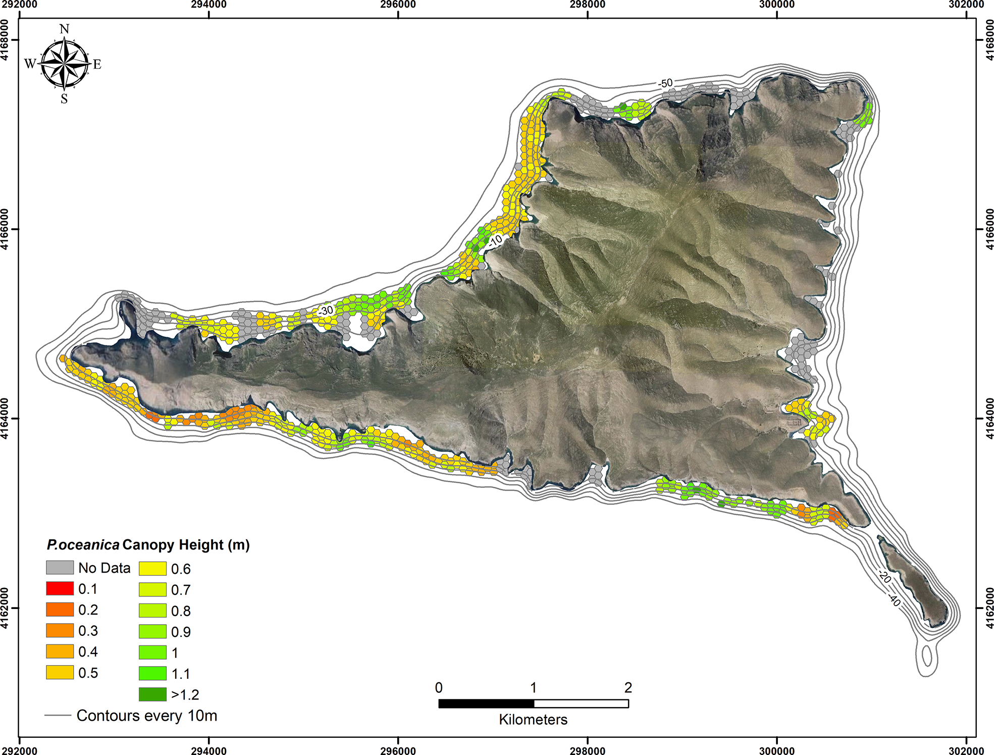 The canopy height data are locally averaged using a grid of hexagonal geometrical elements with a side dimension of 75 m (Figure 6) The mean canopy height of P. oceanica in the whole area is 0.6 m, while the maximum height was over 1.2 m. Areas where the presence of P. oceanica through the geophysical and ground-truthing survey was verified, but its height was not measured, appear as No Data. The whole north-western coast of the island is the area where the most extended meadows are present. This is because the bathymetry of the area is smooth, creating a bathymetrical plateau between 10 and 40 m depth, thus leaving enough space for the meadows to grow. Second to this area, in regard of the meadows extended, are the west and east parts of the south coast. The patches of P. oceanica are found along the whole coast of the island with the only areas lacking any kind of growth being those of steep slopes and rocky substrates.
