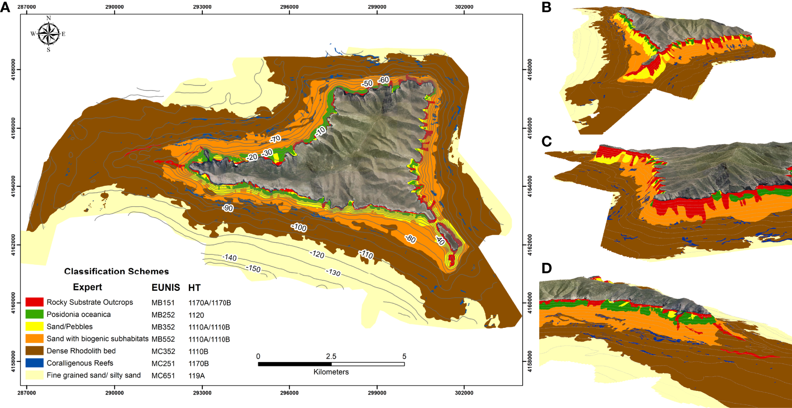 While expert classification possesses the advantage of segmenting the survey areas in many different BTs as to better describe its properties, it has limited applications as it is only relevant to each specific area (case specific). To overcome this issue, many classification schemes have been introduced as a guideline tool for habitat mapping. Three of these guidelines are the NATURA HABITAT DIRECTIVE-HD (92/43/EEC) and EUNIS schemes introduced by the EU and the SPA/RAC and MAP scheme that is a product of the ongoing effort of the Barcelona Convention (SPA/RAC-UN Environment/MAP, 2019).