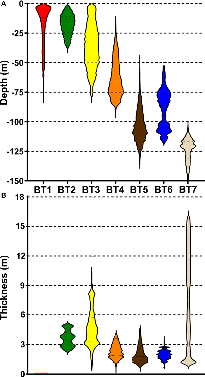 (A) Depth and (B) sediment thickness violin plots of the bottom types mapped at Gyaros seafloor.